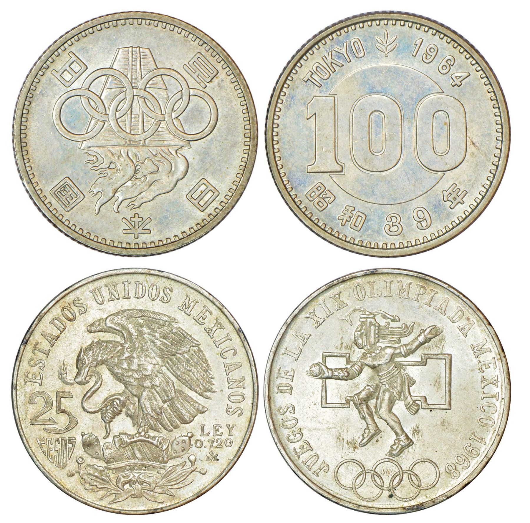Summer Olympics half silver coins (2), (a) Japan, 100 yen, 1964, KM Y#79, 4.84g and (b) Mexico, 25 pesos, 1968, 22.38g. (2 coins)