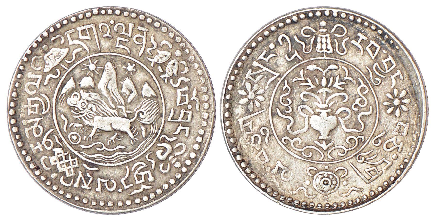 Tibet, silver 1 ½ srang, KM Y24, 6.04g. Obv: Snow lion facing in front of mount Kailash with two sun in the background. Rev: Threasure vase (a Buddhist auspicious symbol), containing foliage with scroll ornaments.