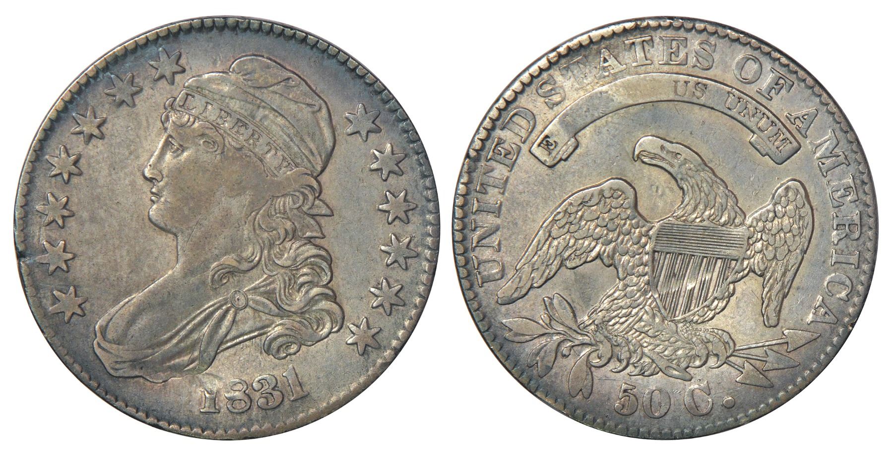 United States of America, silver 50 cents, AD 1831, KM 37, 13.40g. Obv: The bust of liberty, facing left wearing a cap. Rev: Eagle holding arrows and an olive branch.