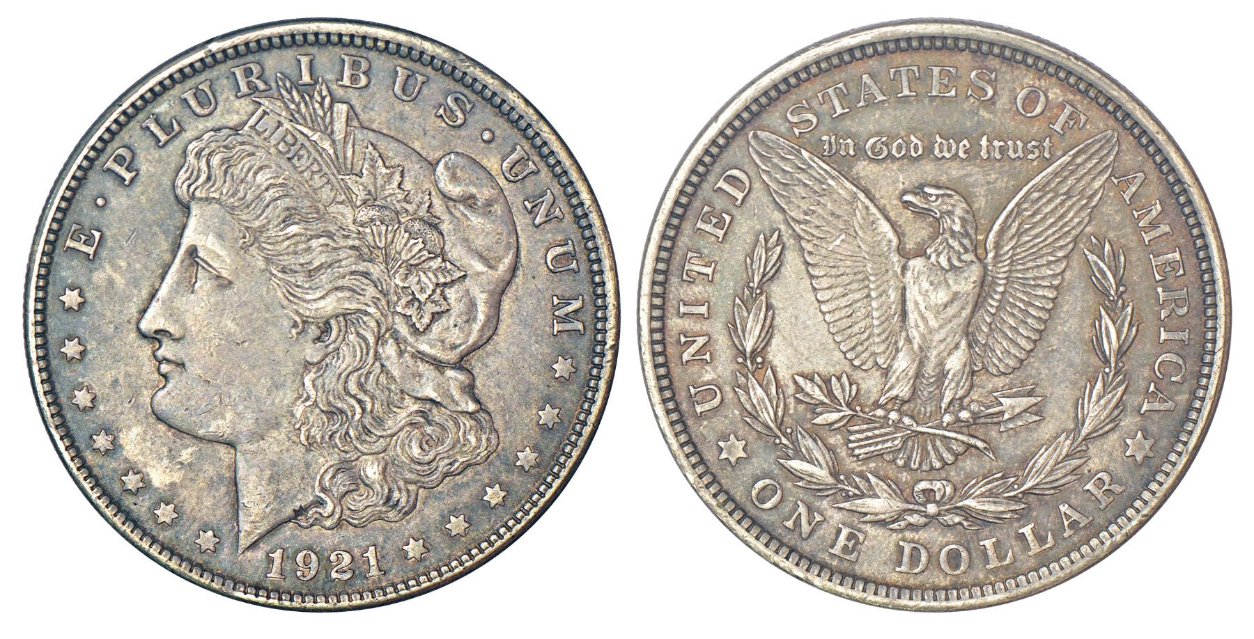 United States of America, silver morgan dollar, 1921, KM 110, 26.75g. Obv: Liberty head facing left, date below. Rev: Eagle holding arrow and an olive branch, within wealth.