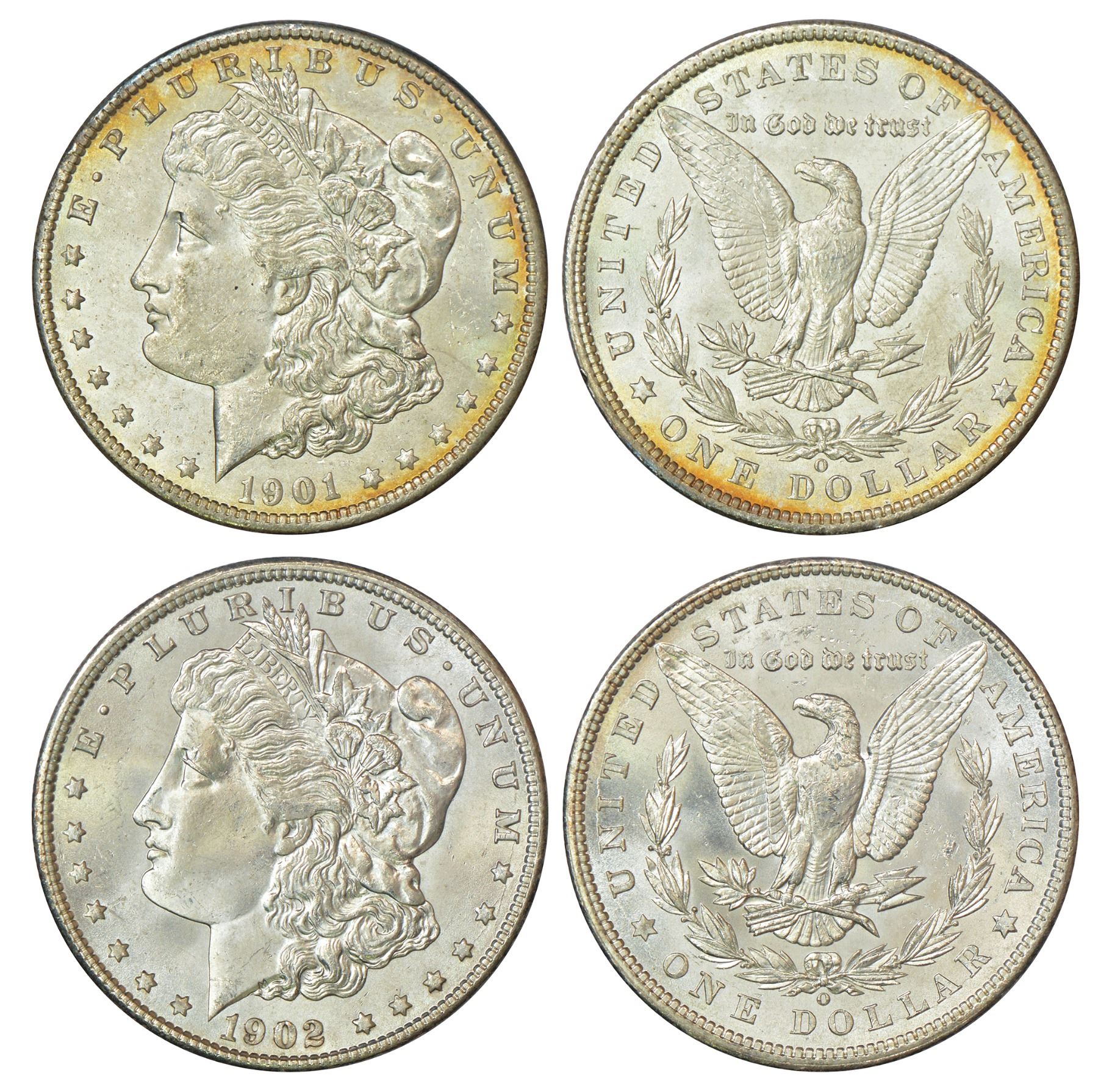 United States of America, silver morgan dollar (2), AD 1901, 26.76g and AD 1902, 26.70g, 'O' mintmark, KM 110. Obv: Liberty headed facing left. Rev: Eagle holding arrows and an olive branch, within wreath. (2 coins)