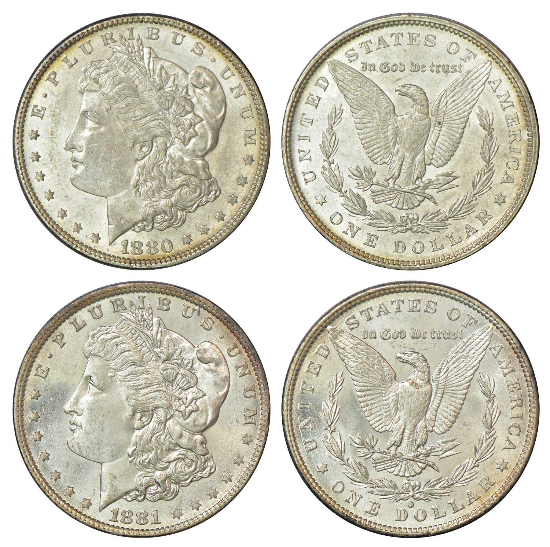 United States of America, silver morgan dollar (2), AD 1880, without mintmark, 26.71g and AD 1881, 26.71g, 'O' mintmark, KM 110. Obv: Liberty head facing left. Rev: Eagle holding arrows and an olive branch, within wreath. (2 coins)