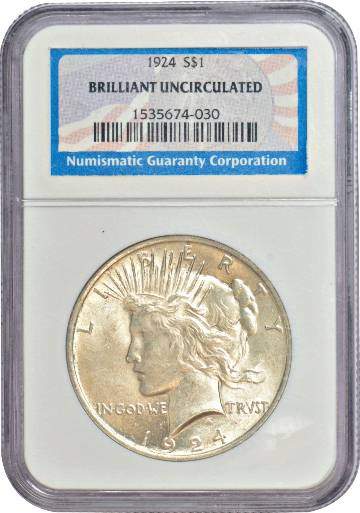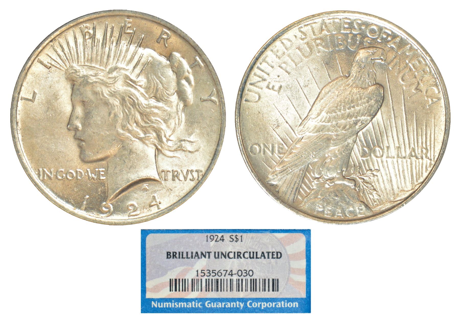 Foreign: United States of America, silver peace dollar, 1924, KM 150. Obv: Liberty head facing left, date below. Rev: Eagle facing right perched on rock.