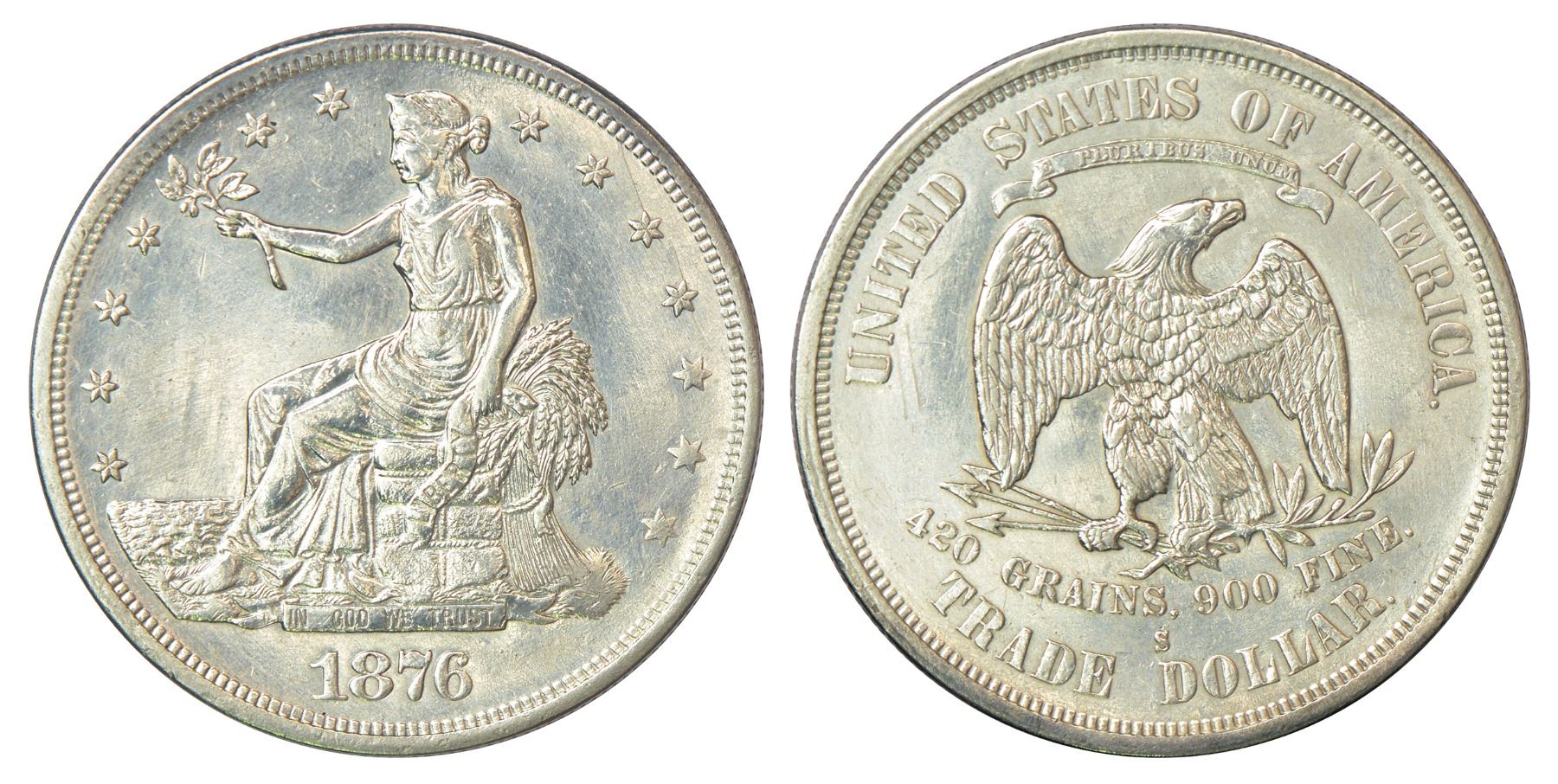 United States of America, silver trade dollar, AD 1876, 'S' mintmark, KM 108, 27.43g. Obv: Seated liberty, date below Rev: Eagle holding arrows and an olive branch.