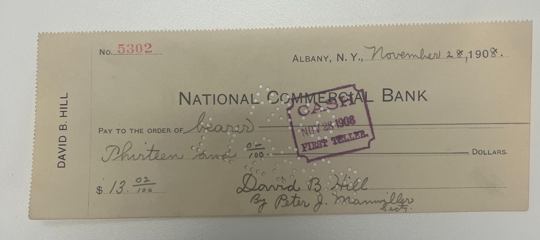 Former Governor of New York David B. Hill 1908 signed check