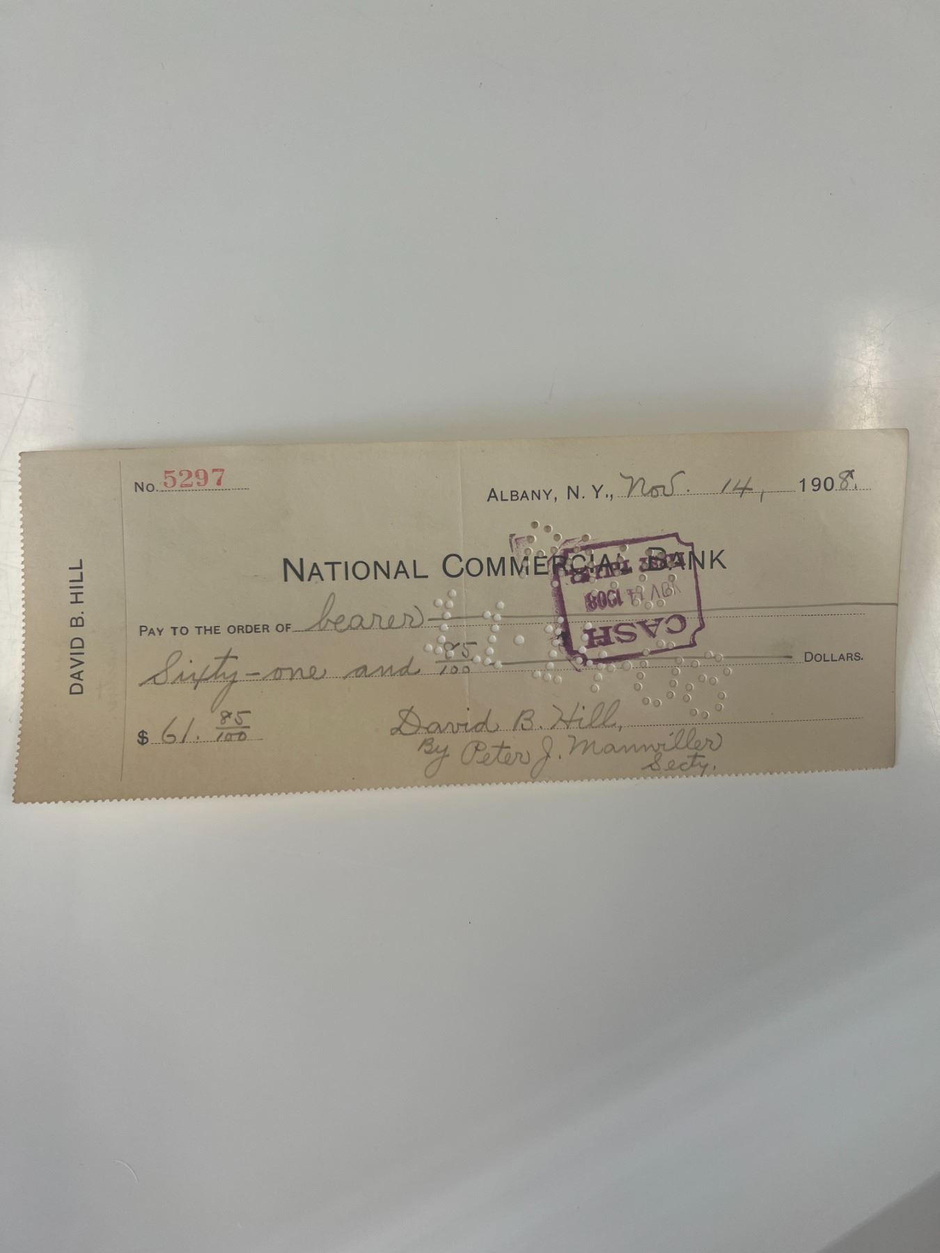David B. Hill signed check - Nov 14th 1908.8x3 inches
