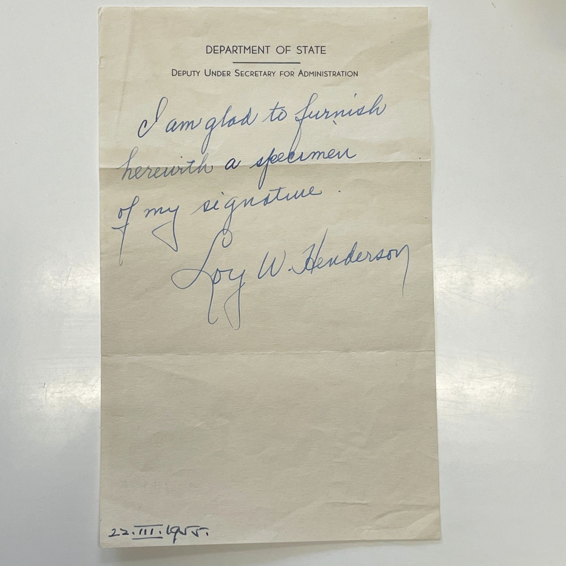 Former United States Minister to Iraq Loy W. Henderson signed 1955 note. 5x8 inches
