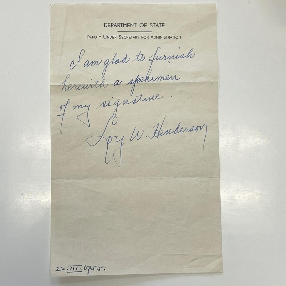 Former United States Minister to Iraq Loy W. Henderson signed 1955 note. 5x8 inches
