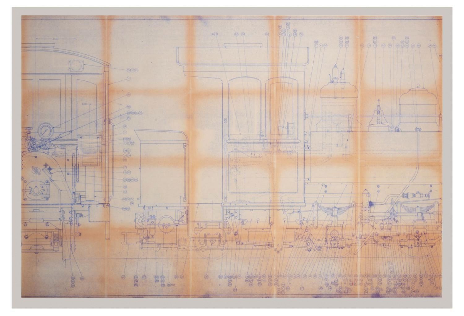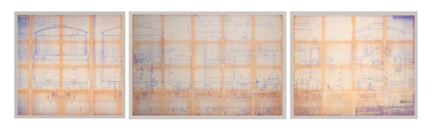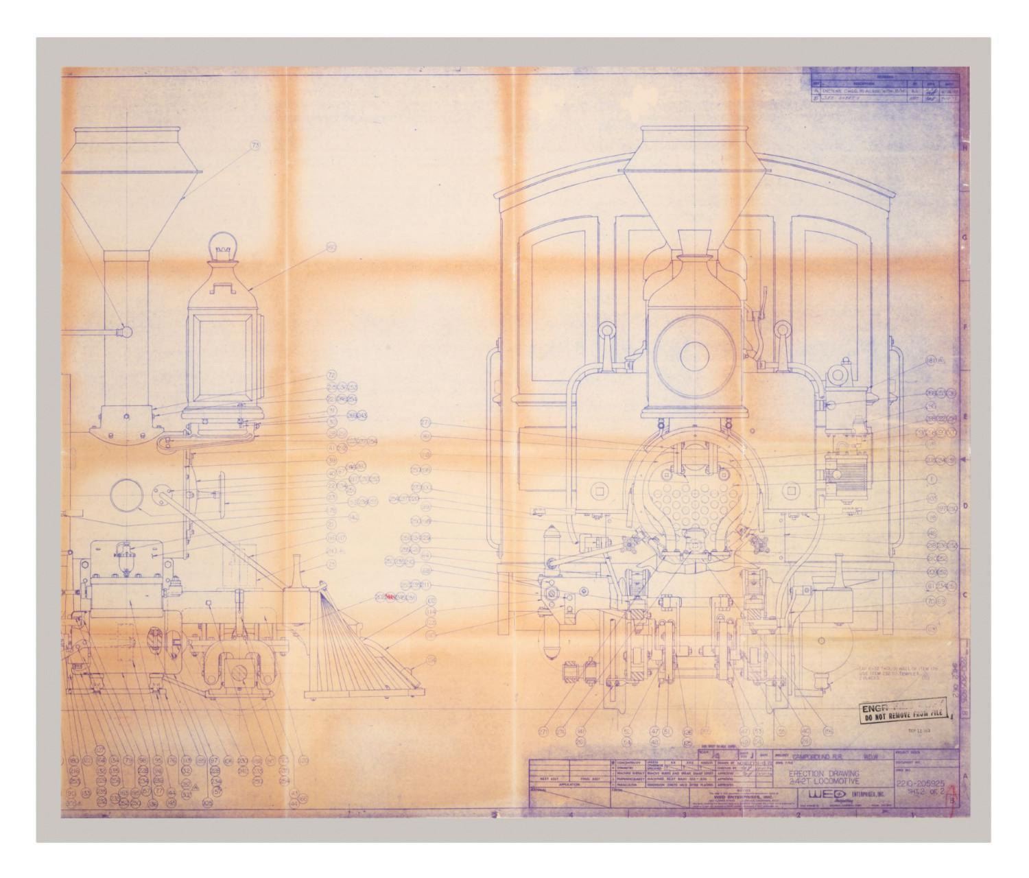 (Walt Disney World, 1972-73) A very large 3-part WED Imagineering architectural rendering of the Fort Wilderness Railroad Locomotive produced by Walt Disney Imagineering. The linen-backed printed rendering is composed of three sections which combine to depict Fort Wilderness' Locomotive 2-4-2T, with additional notations and a revised stamped date of 09-12-73. Although the F.W.R.R. was only in operation from 1974-80, railroad ties and portions of its right-of-way are still present on resort property. This very rare oversized rendering offers a unique perspective into the development process of a fondly remembered Walt Disney World attraction. Comprised of three separate pieces, when combined the full rendering measures 36.5"x136". Each of the three sections has been linen-backed for their preservation, and displays in good condition with some discoloration and surface wear throughout from use and age.