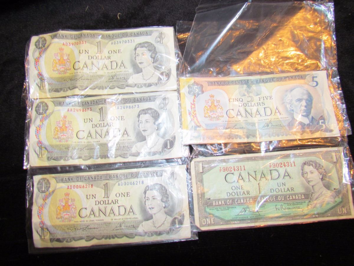 Four $1 Bills. One $5 Bill - 1954, 1973, 1979