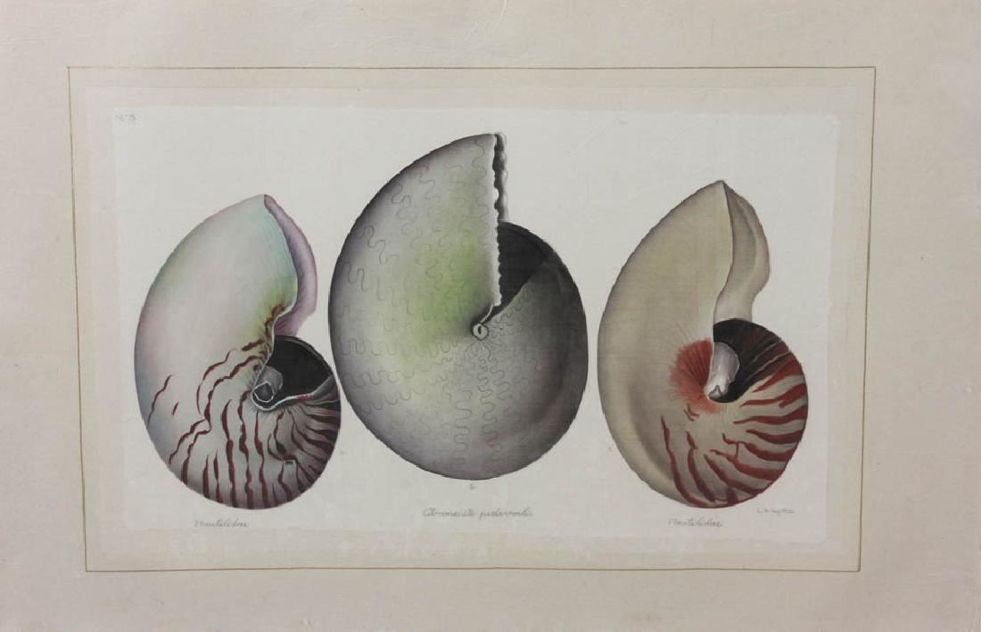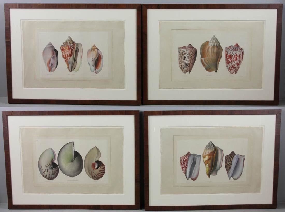 Antique colored prints of shells, four (4) in total, custom-matted frames, 31" x 42" in frame. Provenance: Vero Beach, Florida estate.