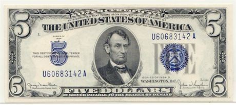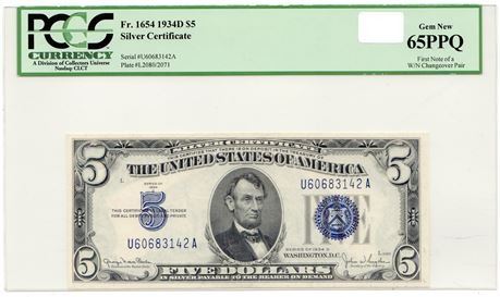 Fr.1654 1934D $5 Silver Certificate - First Note of a W/N Changeover Pair PCGS MS-65 PPQ Estimate: $175 5334.07