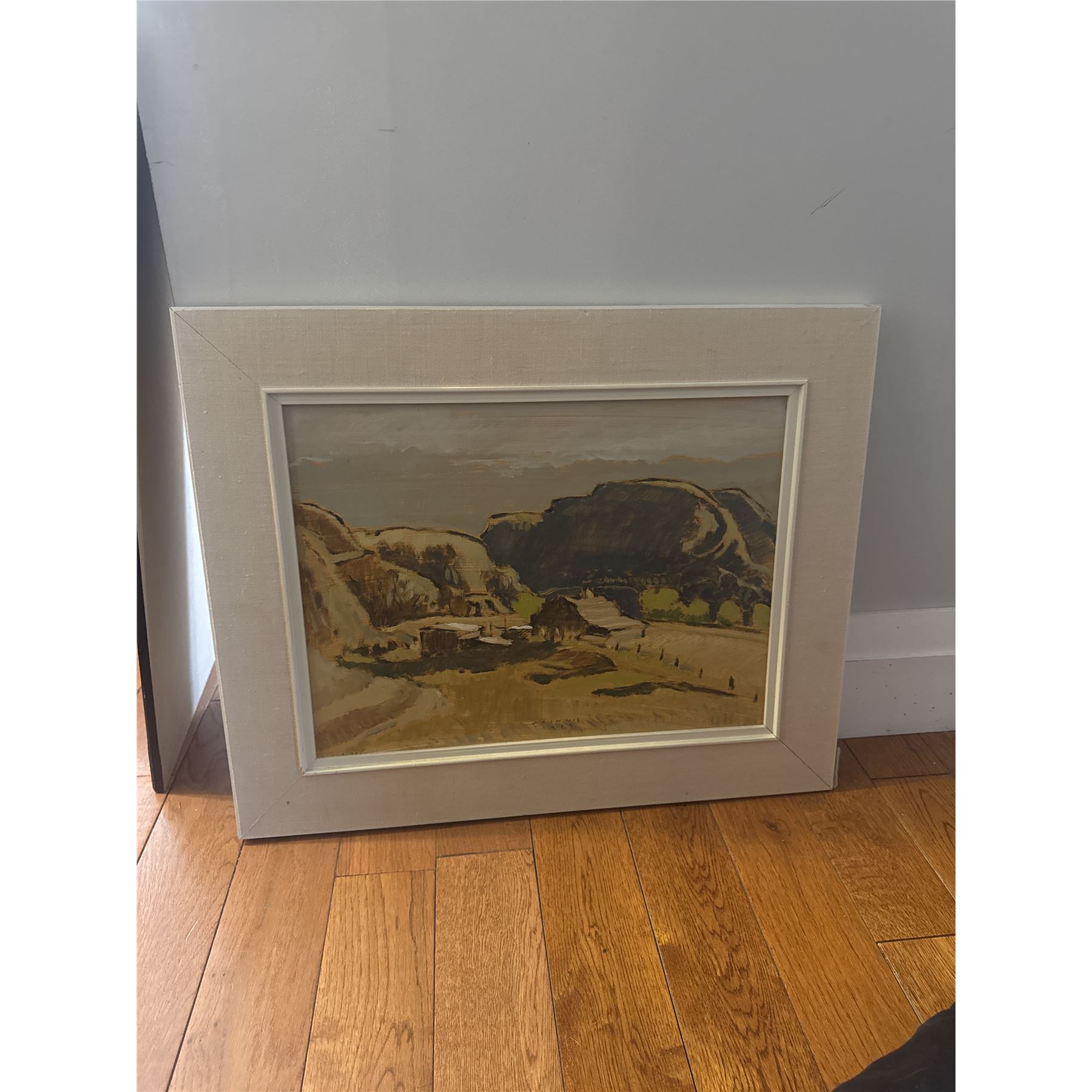 Frame countryside painting measures 21 inches wide by 17 inches tall