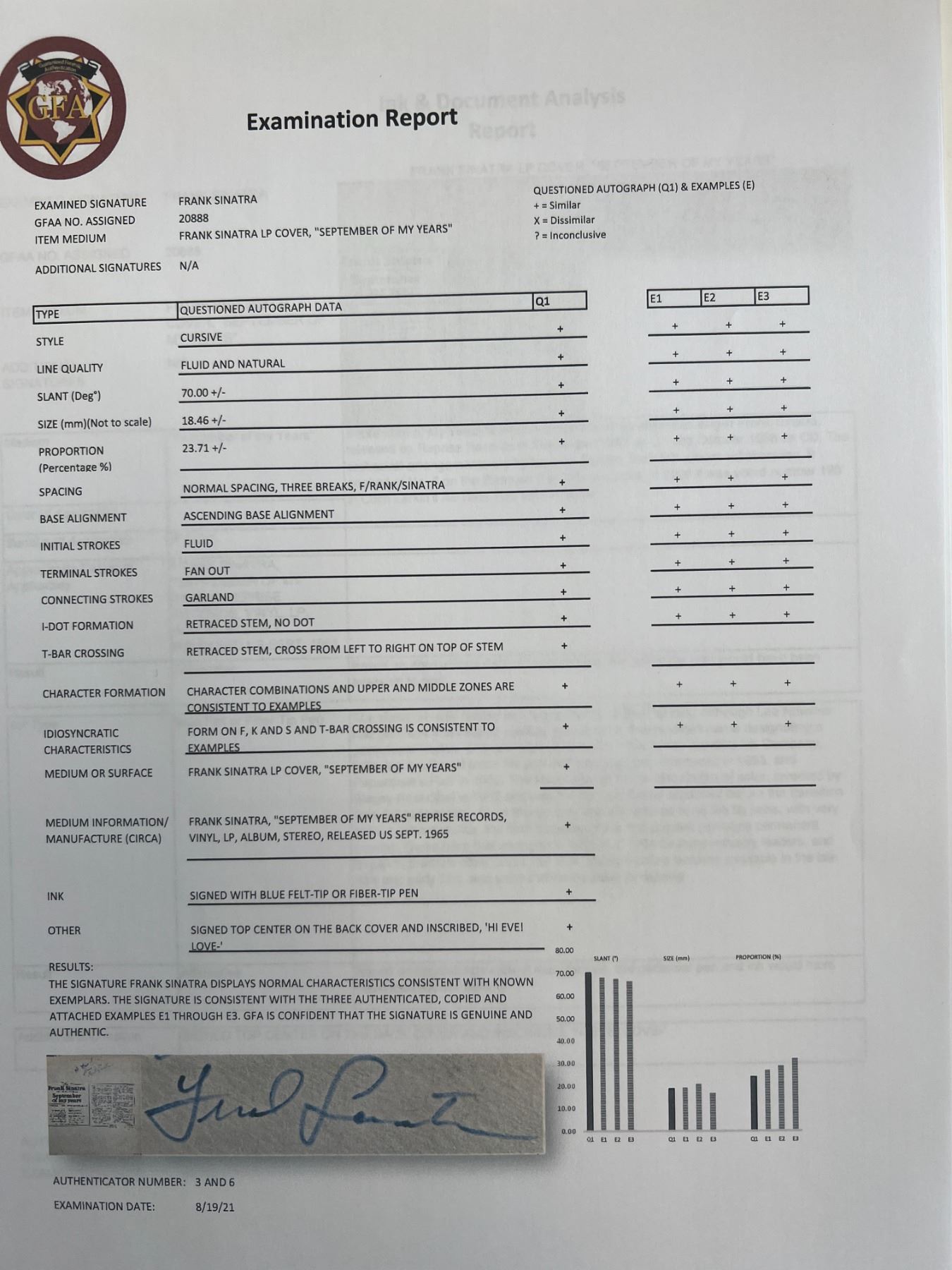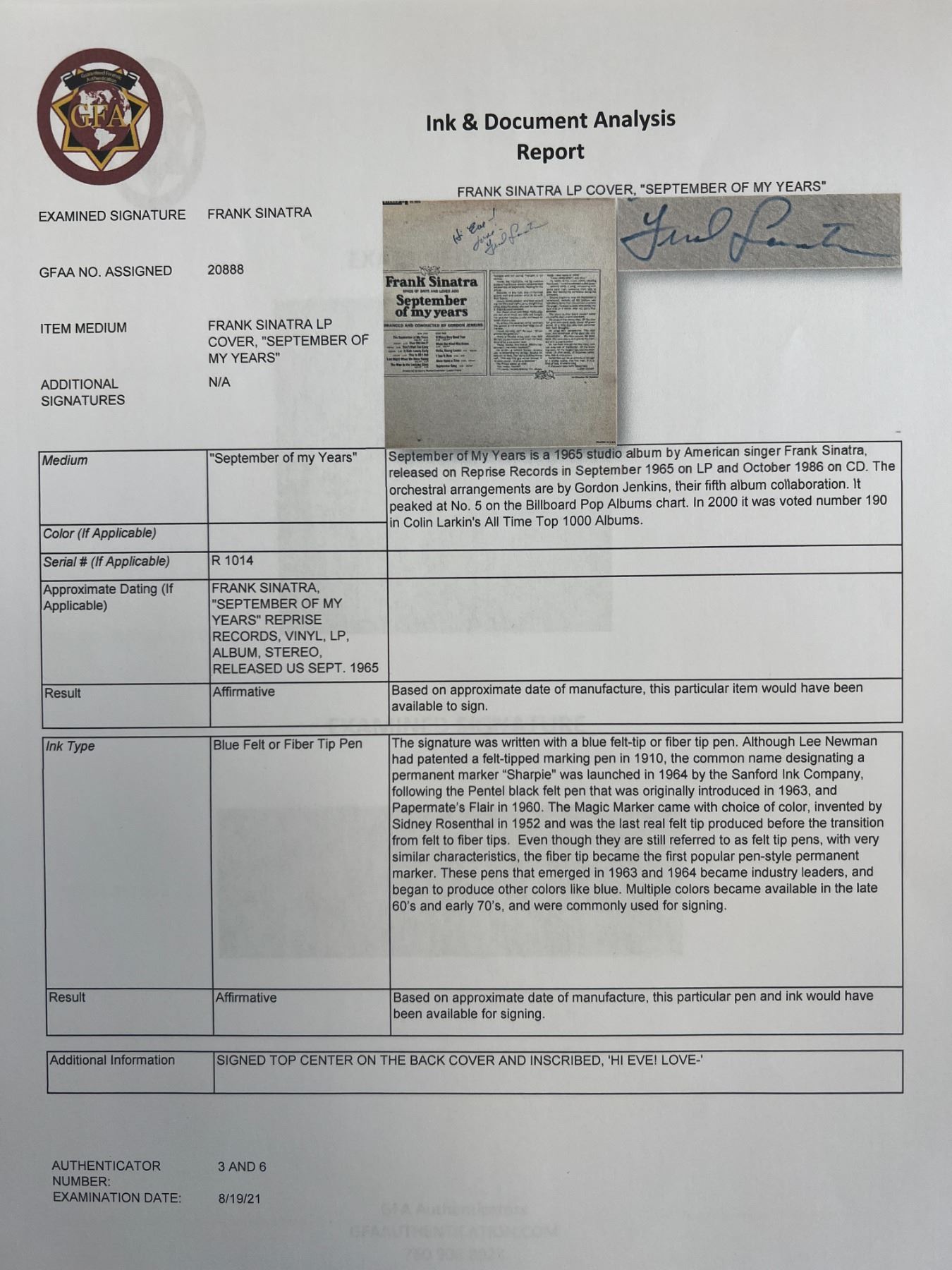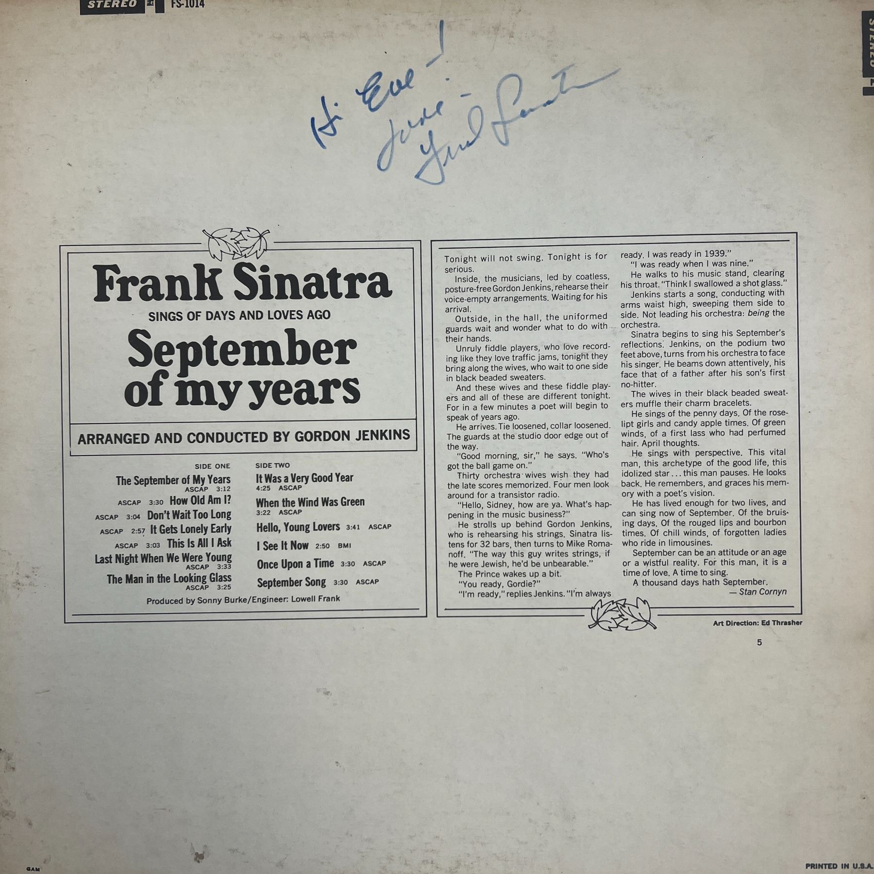 Frank Sinatra September of my years signed album. Vinyl included. 12 x 12 inches. GFA Authenticated