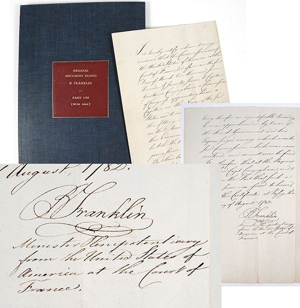 The letter is written on laid, watermarked paper. Ironically, the watermark on one page shows a robed Britannia seated beside a rampant lion within the enclosure of a picket fence; Britannia supports a spear holding a hat; to the left of the spear is "Pro Patria"; on the other page is "GR" below a crown. Fine, with a magnificent, large and bold signature of Franklin and the red wax seal intact at the left. There are a few small edge splits at folds and mounting remnants down one edge of the verso of the integral blank leaf. The letter is housed in a handsome blue slipcase with red leather labels printed in gold. A significant and utterly fantastic document showing the American government helping a privateer who was of immense aid to the American cause during the Revolutionary War.