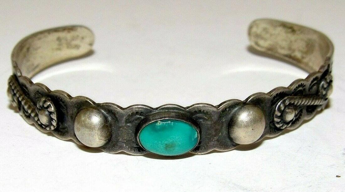 For your consideration is this stunning, rare example of vintage, collectible Native American Art. This fine, vintage, Fred Harvey era stacker cuff bracelet features a traditional design in coin silver that has been intricately hand etched and hand stamped all around the cuff, accented with a turquoise accent in the center. Nice vintage condition, patina, age appropriate wear. The piece is marked "coin silver", unsigned as most vintage Native American jewelry pieces. The inside circumference of the bracelet is about 7" including gap, the gap is about 1 1/2" and can be carefully adjusted. Exceptional Harvey era piece to add to any jewelry collection!