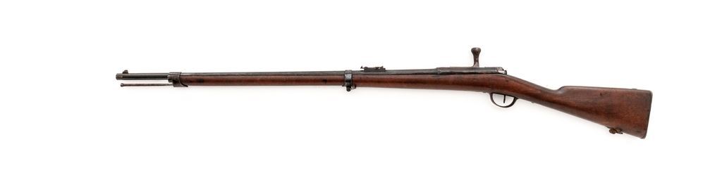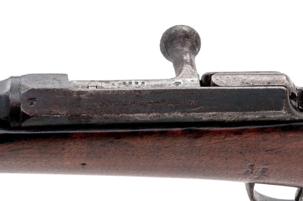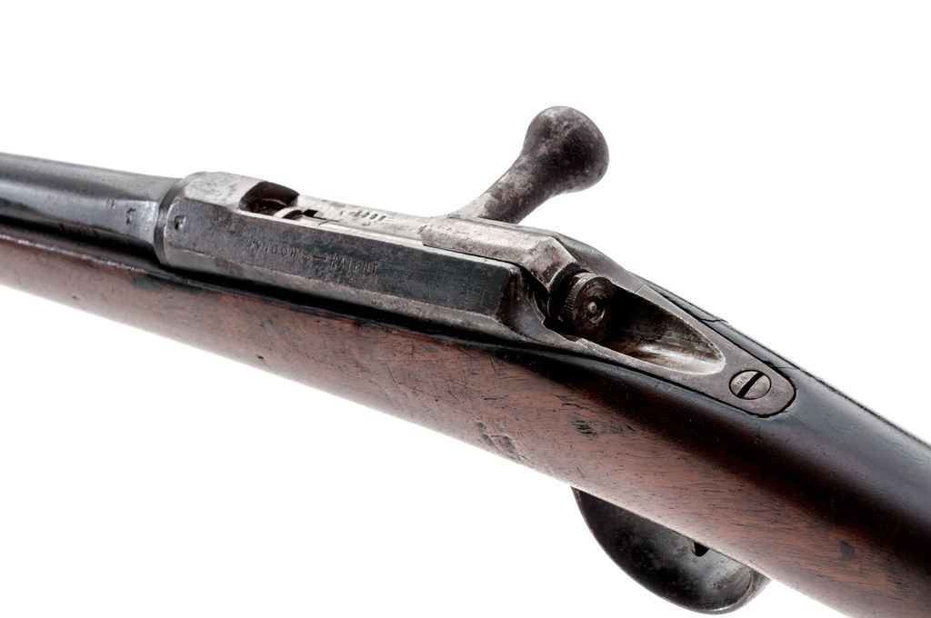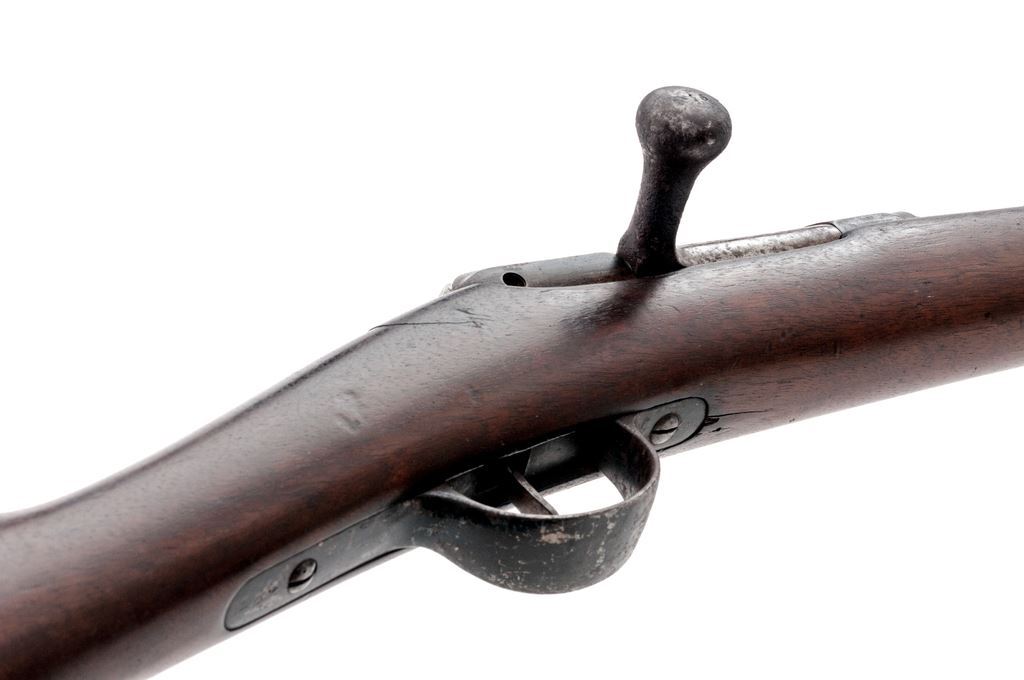 French Kynoch Model 1873 Gras Bolt Action Rifle, #5008, .43 cal., 32.4" barrel, blued finish, hardwood stock, inverted "V" front sight and adjustable folding leaf rear sight. As converted under French military contract from the Chassepot to the Gras design, rifle is marked on barrel flat "KYNOCH-GUN-FACTORY-ASTON" over "MUSKET-43-77-380". Left side receiver is marked "KYNOCH'S-PATENT". Matching numbers on bolt handle but mismatched numbers on cocking piece and cleaning rod. Condition overall is good with the metal retaining approx. 60% finish, which shows overall scratches and patina. Bolt handle is dark and pitted; smaller parts also show rust and patina. Stock is cracked at the tang and trigger guard, otherwise wood is good with a few bruises and overall darkening. Action is smooth, bore has darkening in the grooves with good rifling. Est.: $600-$900. (Antique)