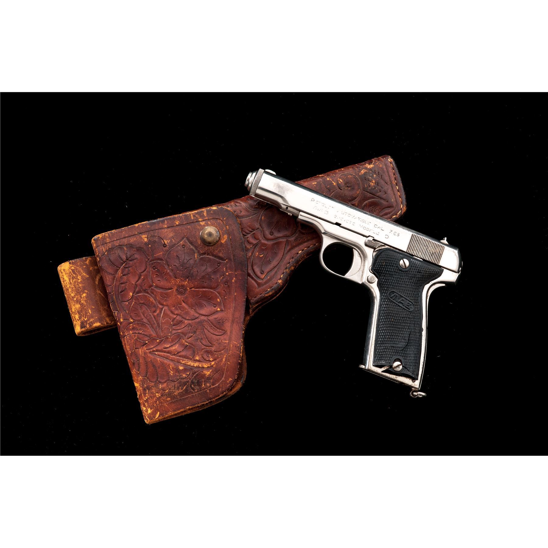 French MAB Model D Semi-Automatic Pistol, #85197, 7.65 Browning Long cal., 4'' barrel, nickel finish, factory checkered horn grips, with one magazine, in floral carved brown leather named holster by Alamo Leather Goods, San Antonio, TX. Condition is good as refinished, retaining approx. 96% nickel over slightly buffed metal. Grips with cracks and losses from shrinkage. Good action and bore. Holster dates from the inter-war period and is marked ''Lt. Herbert L. Sauermann/0-2210152''. No doubt a mid-century Army officer. Holster is good overall with oil darkening and light scuffs. Est.: $300-$500. (C&R)