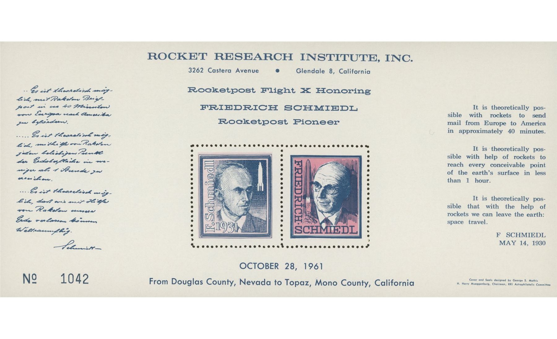 Rocketpost Flight X Honoring Friedrich Schmiedl Rocketpost Pioneer, US Stamps, Oct 28 1961