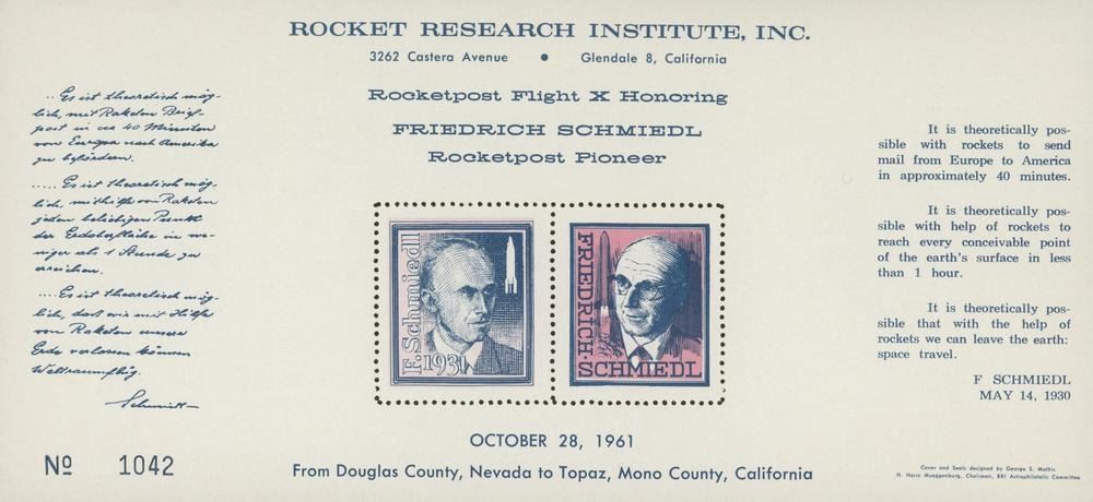 Rocketpost Flight X Honoring Friedrich Schmiedl Rocketpost Pioneer, US Stamps, Oct 28 1961