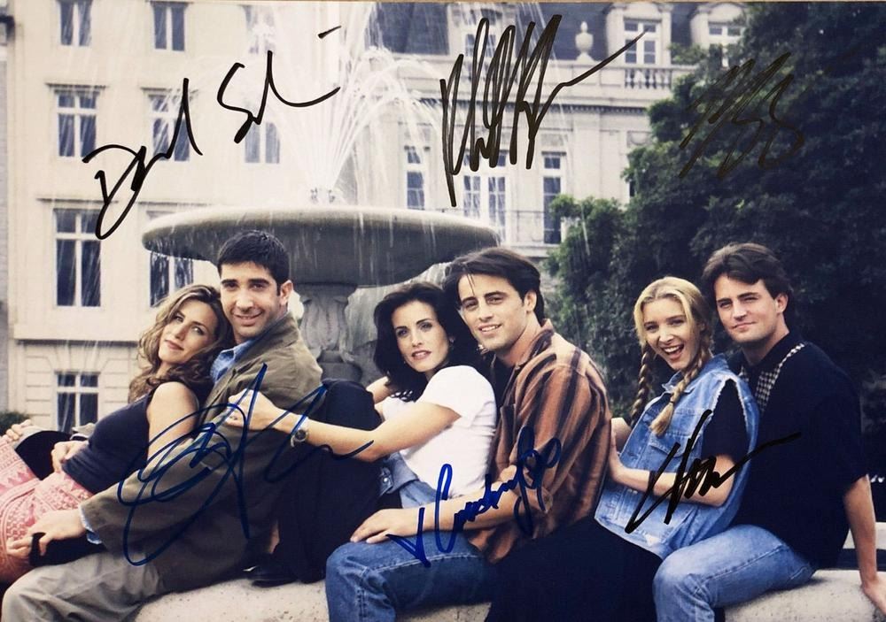 Friends cast signed photo autographed by Matt LeBlanc, Courtney Cox, Matthew Perry, Jennifer Aniston, and David Schwimmer. 8x10 inches. This item is a reprint of an original autograph.