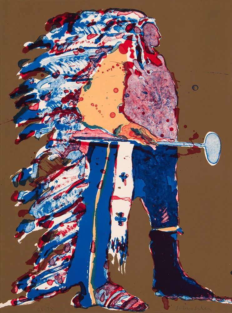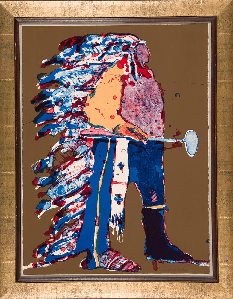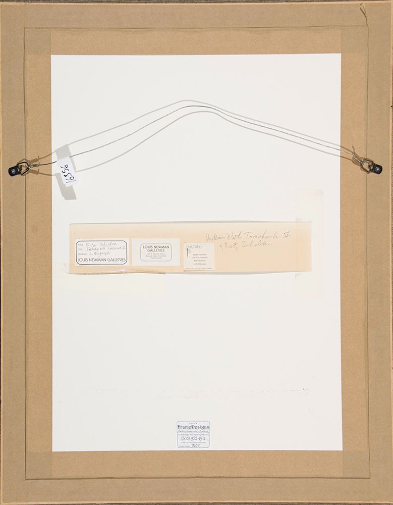 Artist: Fritz Scholder; Title: Indian with Tomahawk II; Medium: Lithograph; Dimensions: 30 x 22 1/2 inches; Signed: Signed in lithograph lower right, edition lower left 65.75; Verso: Edition 65/75; Framed/Base: 36 x 29 inches