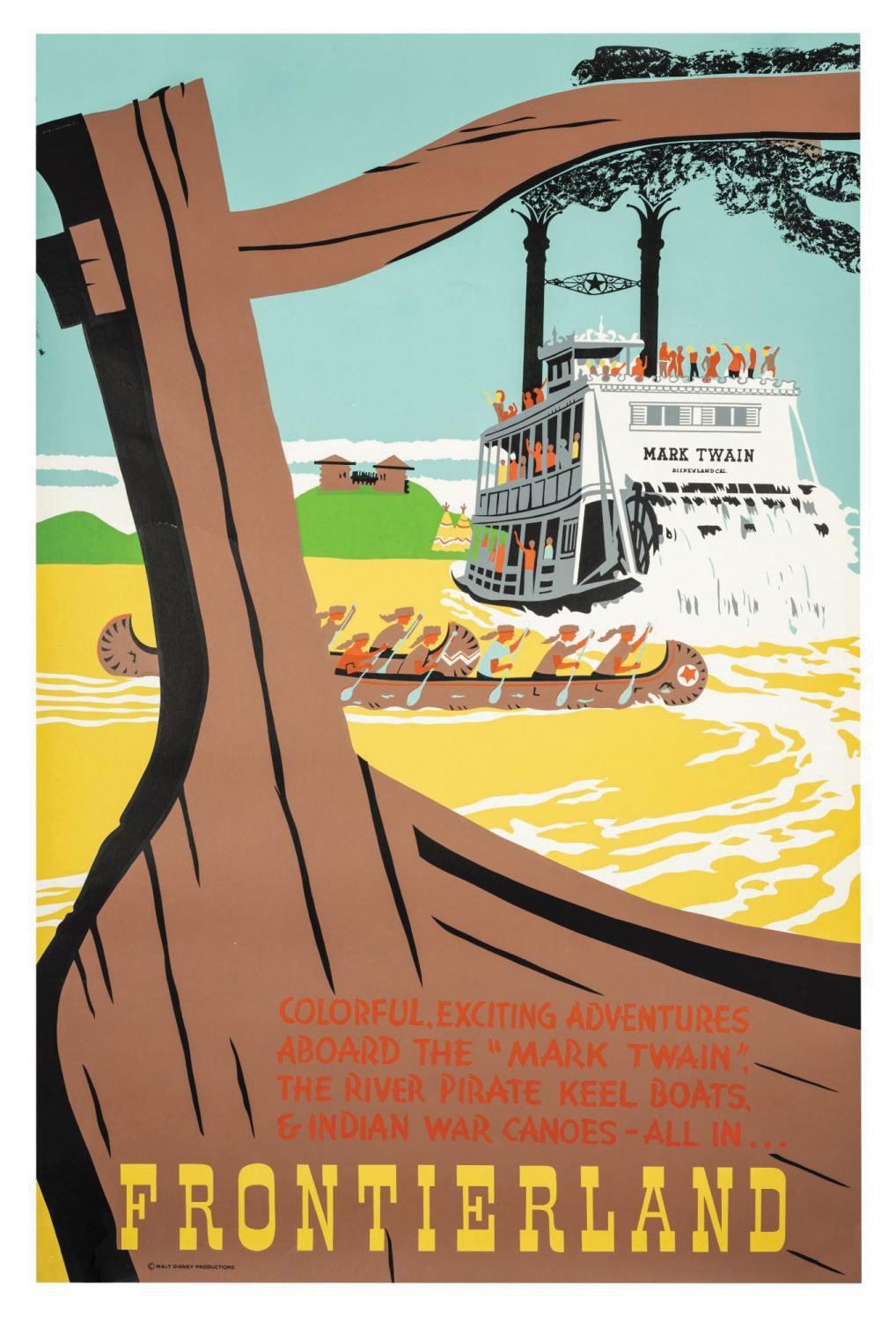 (Disneyland, 1955) A hand-silkscreened attraction poster for Frontierland. Designed by Bjorn Aronson, the poster's lively layout prominently features the Mark Twain, Keel Boats, and Indian War Canoes in bold color. The poster measures 54"x36" and is in very good condition, exhibiting a few minor creases and scuffs with some edge-wear.