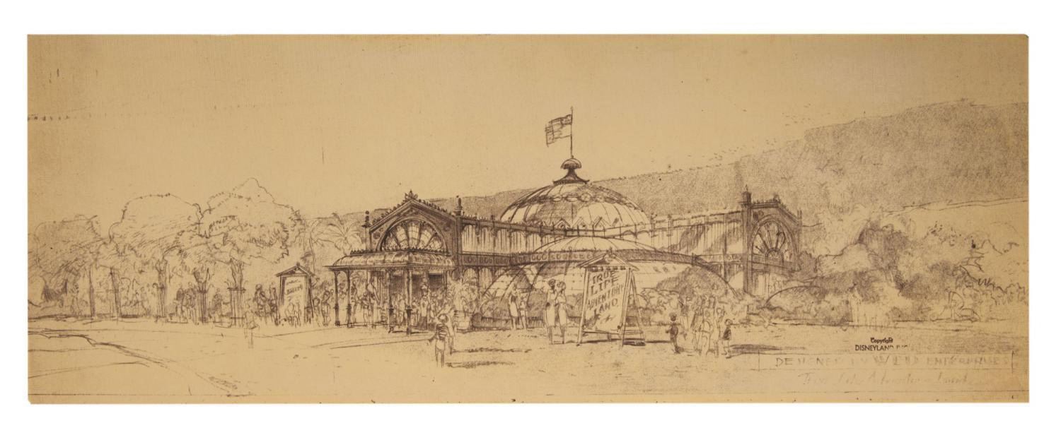 (Disneyland, c.1990s) A concept art print depicting Imagineer Herb Ryman's Frontierland Waterfront concept. The concept includes several features that would outlast the initial pre-opening development phase and eventually become mainstays of Frontierland, including The Golden Horseshoe saloon and Mark Twain Riverboat. The print was likely produced for a display to honor some of the early concept work that went into the creation of the Park. Measuring approximately 17"x36.5", the concept print is mounted to foam board and displays in fine condition.