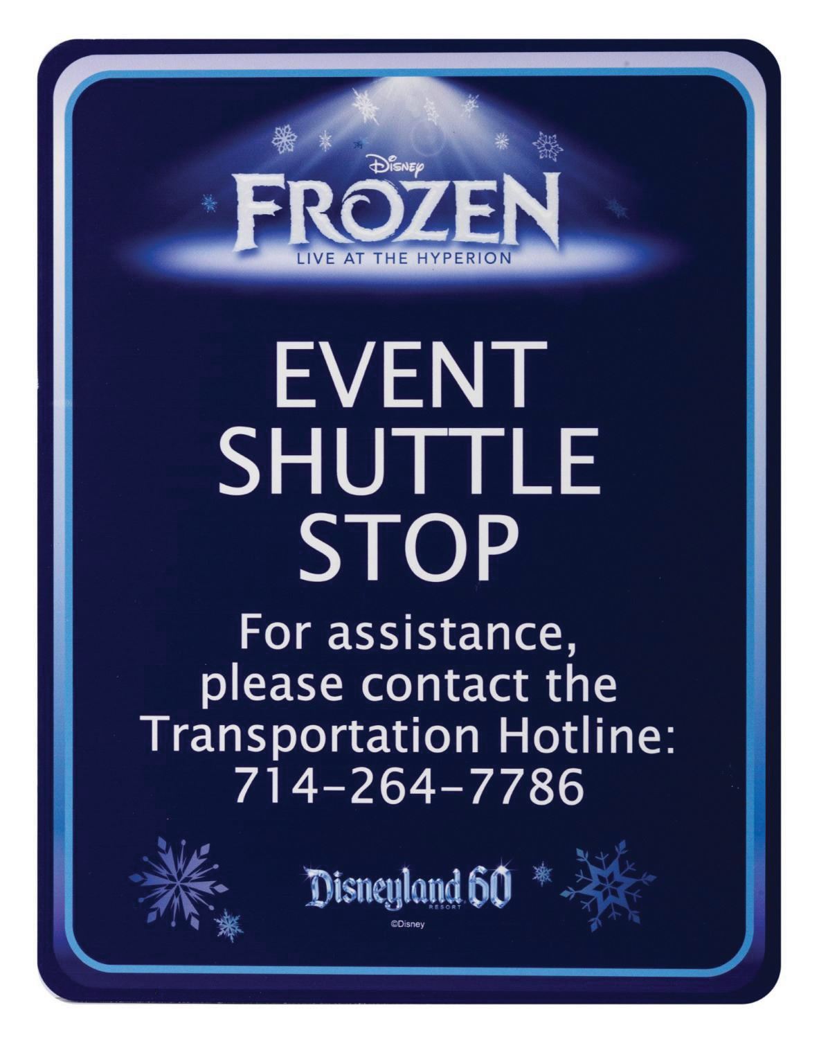 (California Adventure, 2016) An event shuttle stop sign utilized to direct audiences of Disneyland Resort Guests for the Disney Frozen Live at the Hyperion event held at Disney's California Adventure Park during May of 2016. Measuring 22"x17", the sign displays in very good condition exhibiting few scratches, scuffs, and wear, in addition to the retention of adhesive Velcro strips on the reverse from original display at the Disneyland Resort.