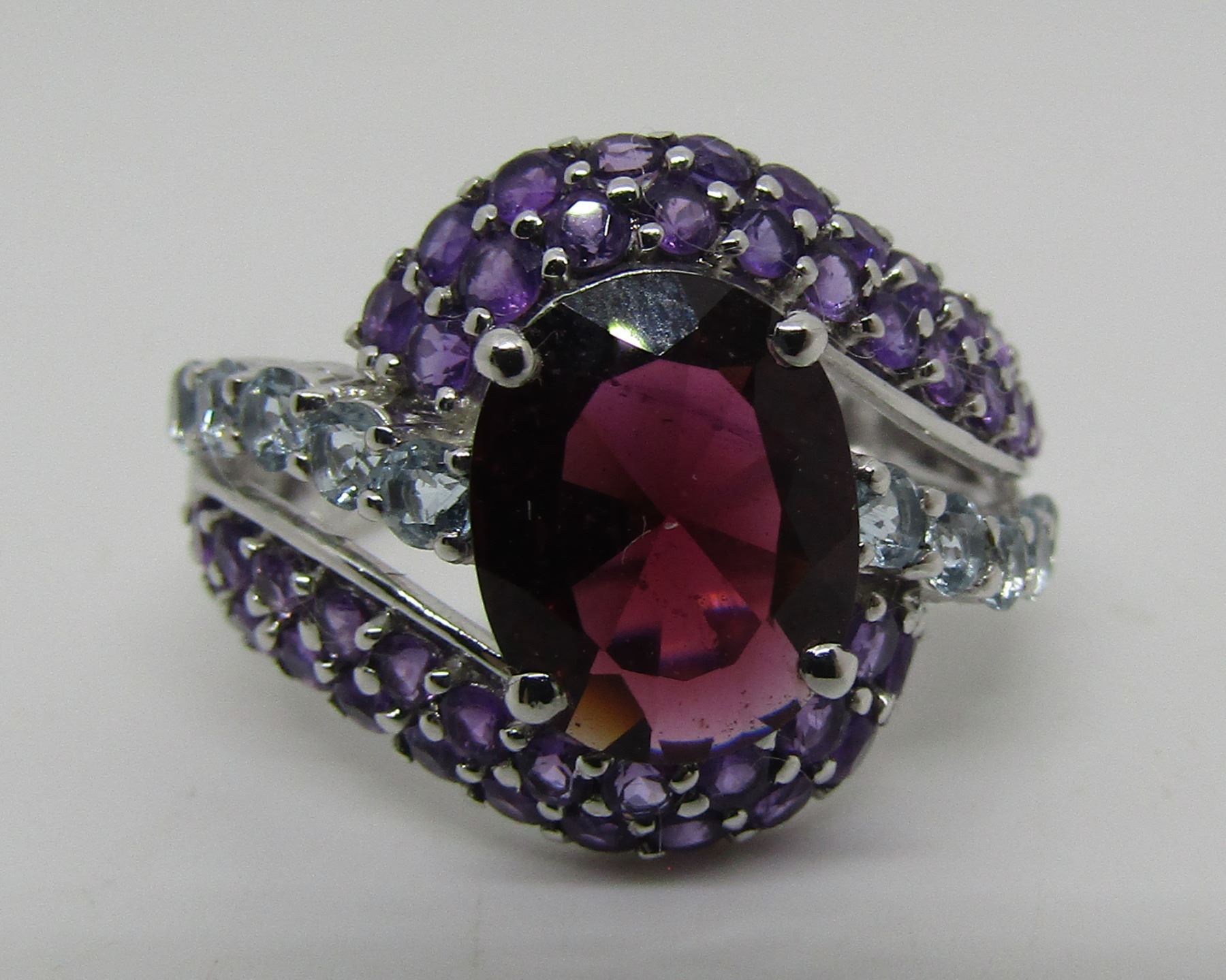 GENUINE 10MM X 8MM GEM RED GARNET SURROUNDED BY 10 AQUA MARINE AND 44 AMETHYST. MARKED "585" GOLD, WEIGHS 5 GRAMS. 15.8 MM WIDE. SIZE 8. EXCELLENT CONDITION VINTAGE ESTATE. USA SHIPPING $8