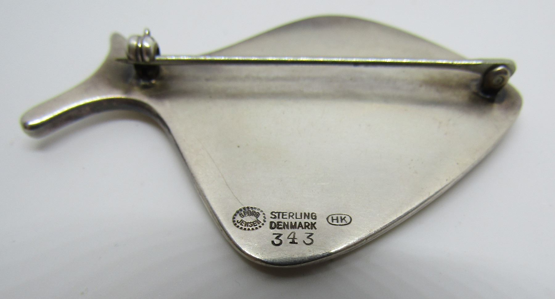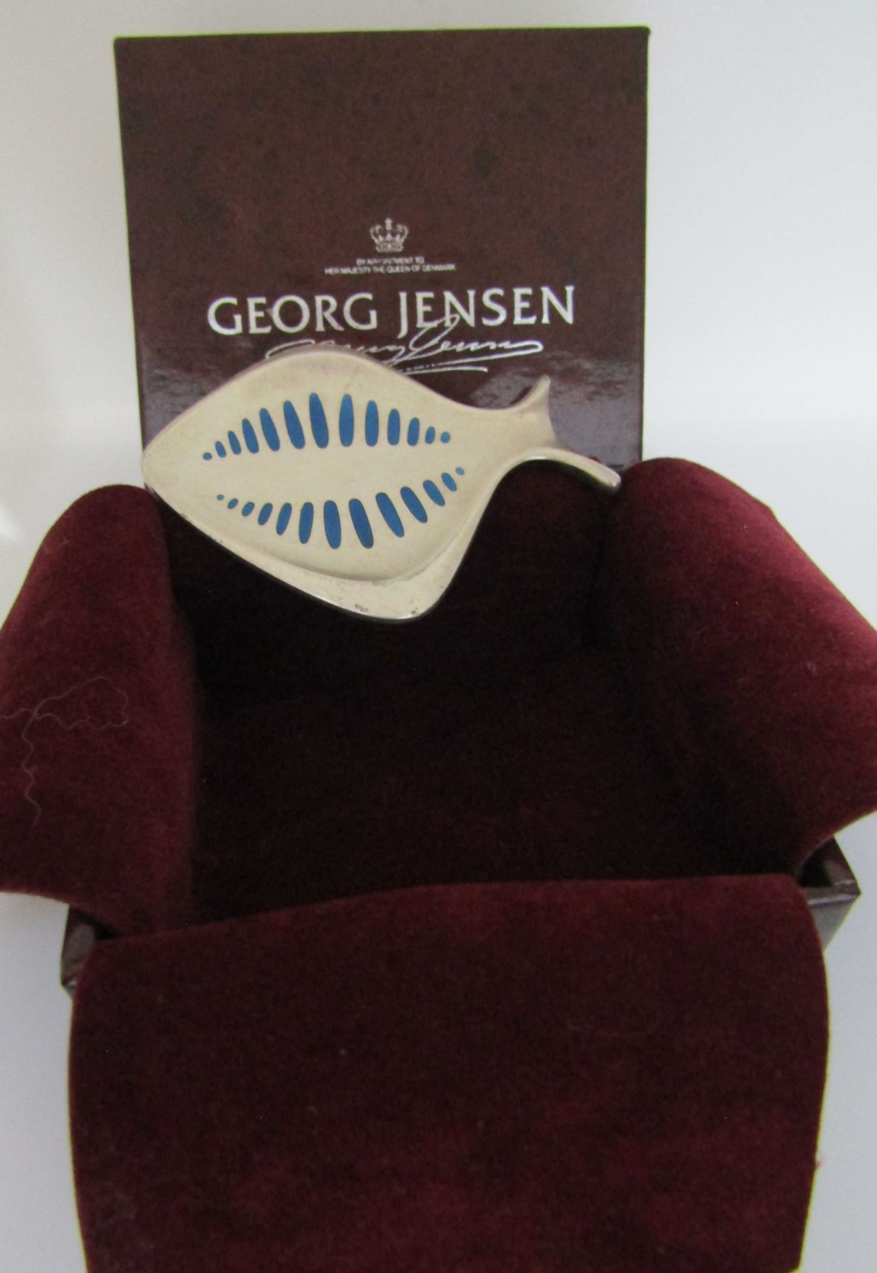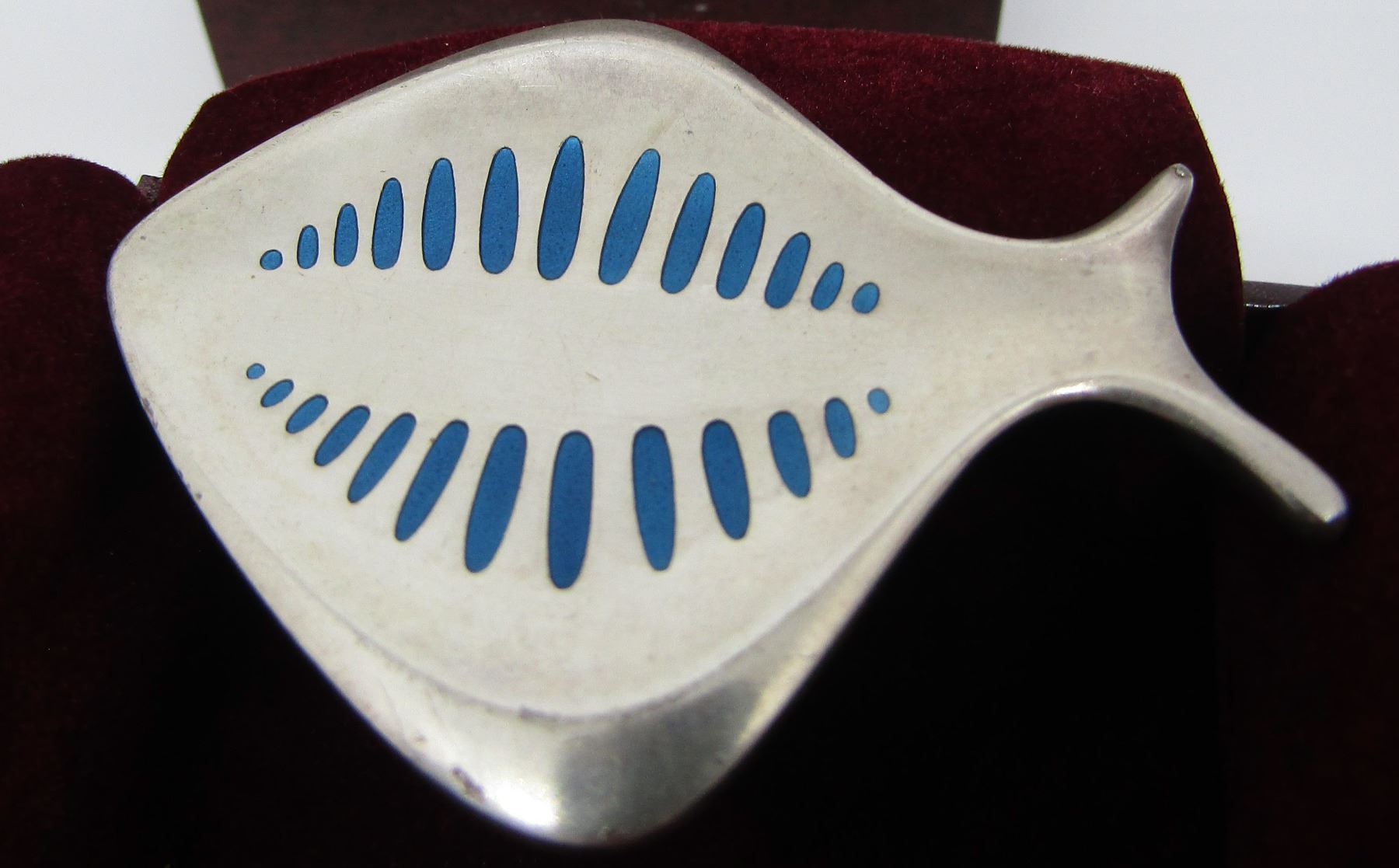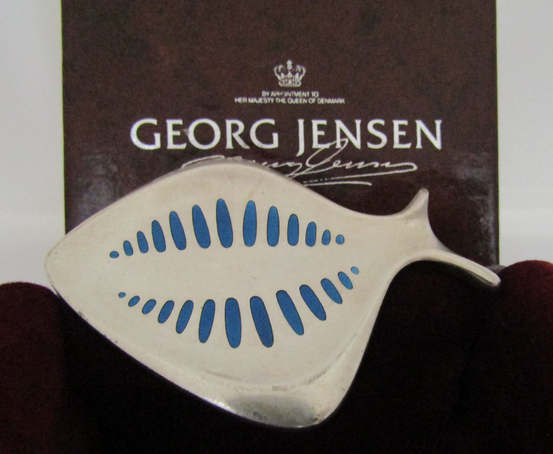 VINTAGE ESTATE MID CENTURY MODERN SIGNED "GEORG JENSEN STERLING DENMARK 343 HK". HENNING KOPPEL BLUE ENAMEL FISH DESIGN. WITH GEORG JENSEN BOX. MEASURES 59MM BY 44MM. WEIGHS 24.4 GRAMS. USA SHIPPING $8.