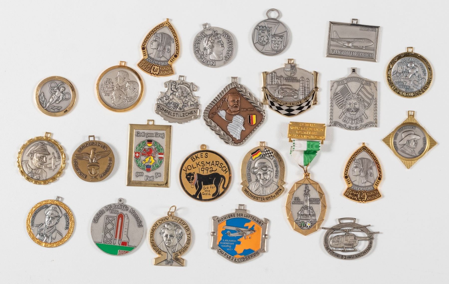 Lot of 24 German made commemorative medals of Rommel, Cleopatra, Apollo astronauts, Werner Haas, the Olympics, and much more. Should be examined.