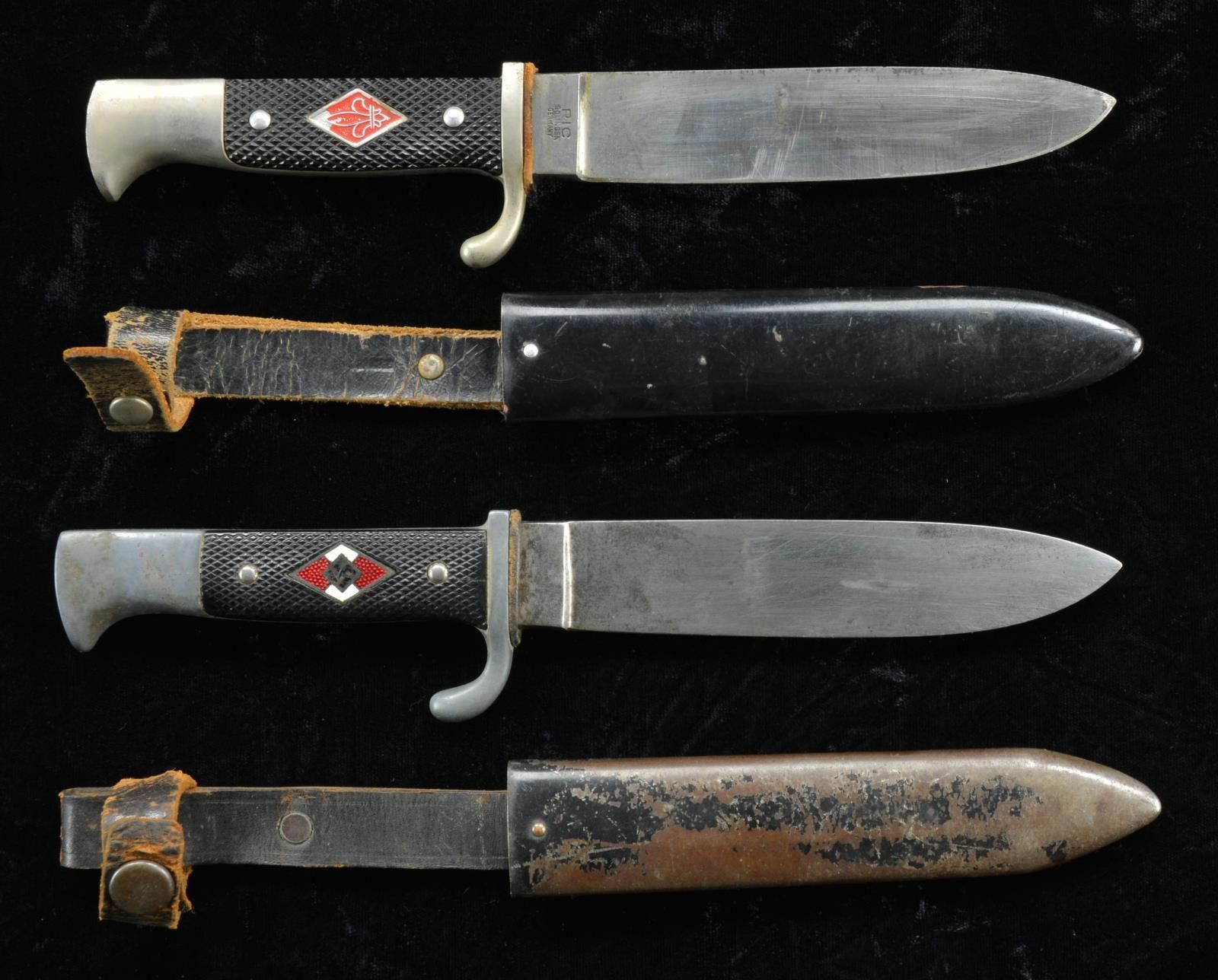 1) WWII K & CO 1940 HILTER YOUTH KNIFE. Overall length: 10". Blade length: 5 1/2" marked w/ "K & CO. / SOLINGEN" maker logo & ricasso marked "M7/11 RZM 1940". Alloy guard & pommel. 2 Piece checkered black composite grips. Red, white & black Hitler Youth diamond in the right grip. Black painted scabbard w/ black leather frog. CONDITION: Fair blade w/ dark gray patina & pinprick pitting. Alloy crossguard & pommel show dark silver tarnish w/ oxidation. Scabbard missing most of patina w/ brown oxidation. Frog shows flexing & deterioration.