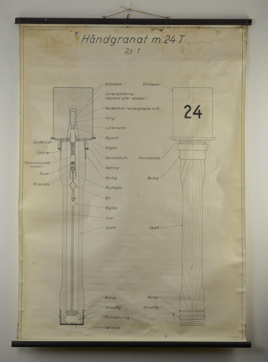 35" x 40" roll up paper cross section diagram of the Handgranate m24T. 2 Wooden dowels are attached to top & bottom of paper w/ string retaining strap. Dated 1951. CONDITION: Fair overall condition w/ staining, lg. tears & wooden dowels having cracks. (02-16916/MD). $300-500.