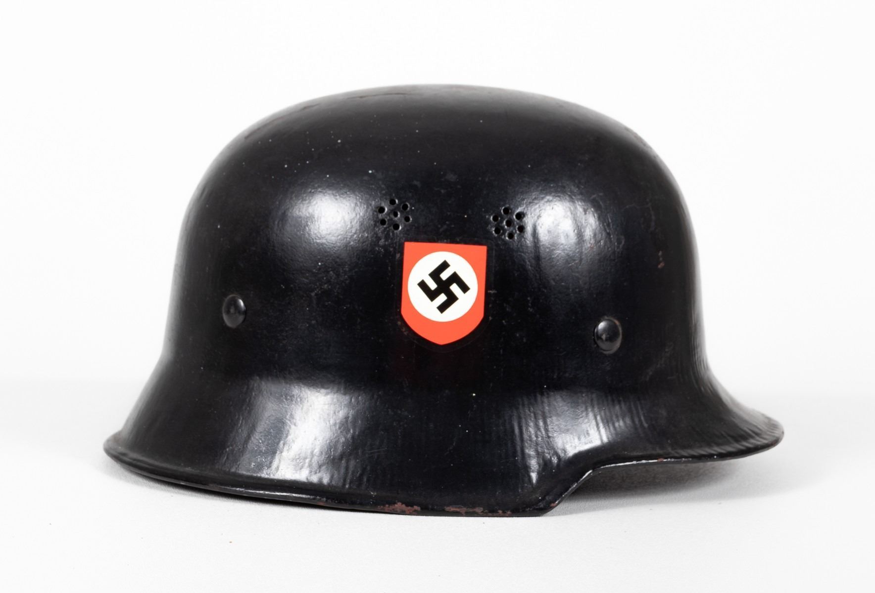 German WWII M34 fire police helmet. Swastika and police eagle decals are applied to each side of the helmet. Leather liner and chin strap present. Liner is stamped '56'.