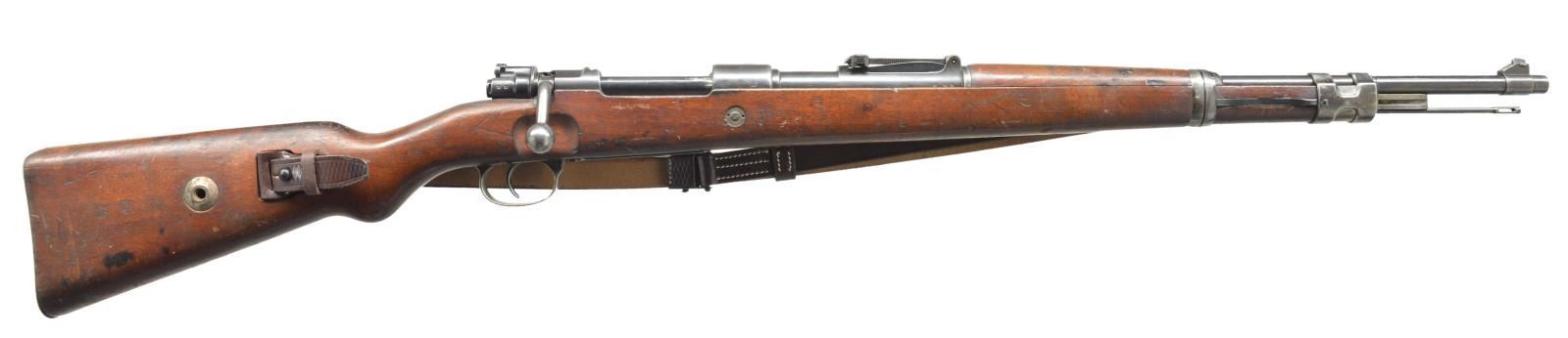 RIFLE. Cal. 8mm Mauser. S# 5431b. Bbl. 23 5/8". All visible numbers match including stock. Scarce early production Model 98K w/ Weimar inspection. Receiver marked on left rail w/ script "MOD.98." Receiver ring marked on top w/ "S/27" indicating mfg. at "Erfurter Maschinen Fabrik (Erma)". Receiver ring marked on left side w/ Weimar "droop wing" eagle proof. Marked on right side w/ 3 "droop wing" eagle "280". Matching bolt assembly has 2 "straight wing" eagle "280" under bolt handle. Tangent rear sight graduated to 2000 meters. Inverted V front sight. Bayonet lug & cleaning rod are present. H type upper band. Matching walnut stock set w/ flat steel buttplate & steel takedown hole. Buttstock marked on right side w/ "droop wing" eagle over "H" indicating Army issue & 2 "droop wing" eagle over "280". Replacement leather sling. CONDITION: original finish stock set has moderate wear, staining & handling marks commensurate w/ rifle that has seen service. Buttstock has notable crack at toe extending approx. 3" forward. Metal has approx. 60% thinning blue turning gray w/ wear & handling marks. Very good shiny bore. (20-3047/RW). CURIO. $800-1,200.