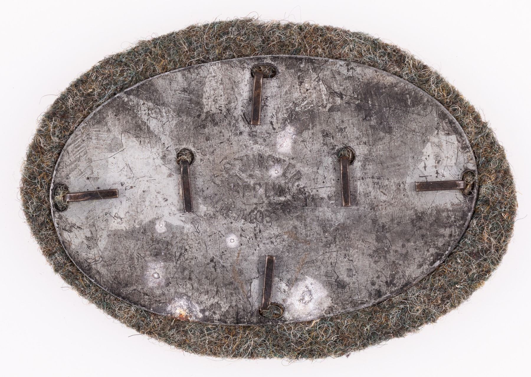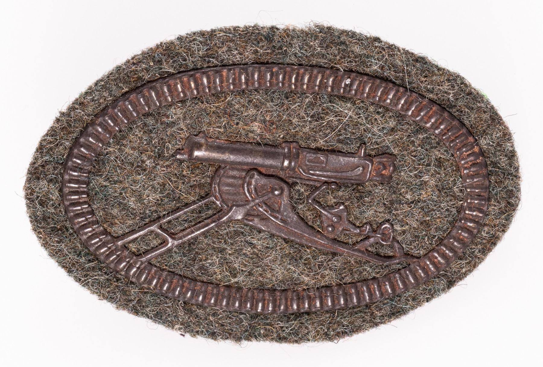 Imperial German WWI Army Machine Gunner's Sleeve Badge. The front shows a German Maxim Machine Gun. Applied to an OD green wool backing. The reverse nickel back plate is maker marked 'C E Junker Berlin Alte Jacobstr 13'. It is held together with six round prongs. 2.5 x 3.5 inches.