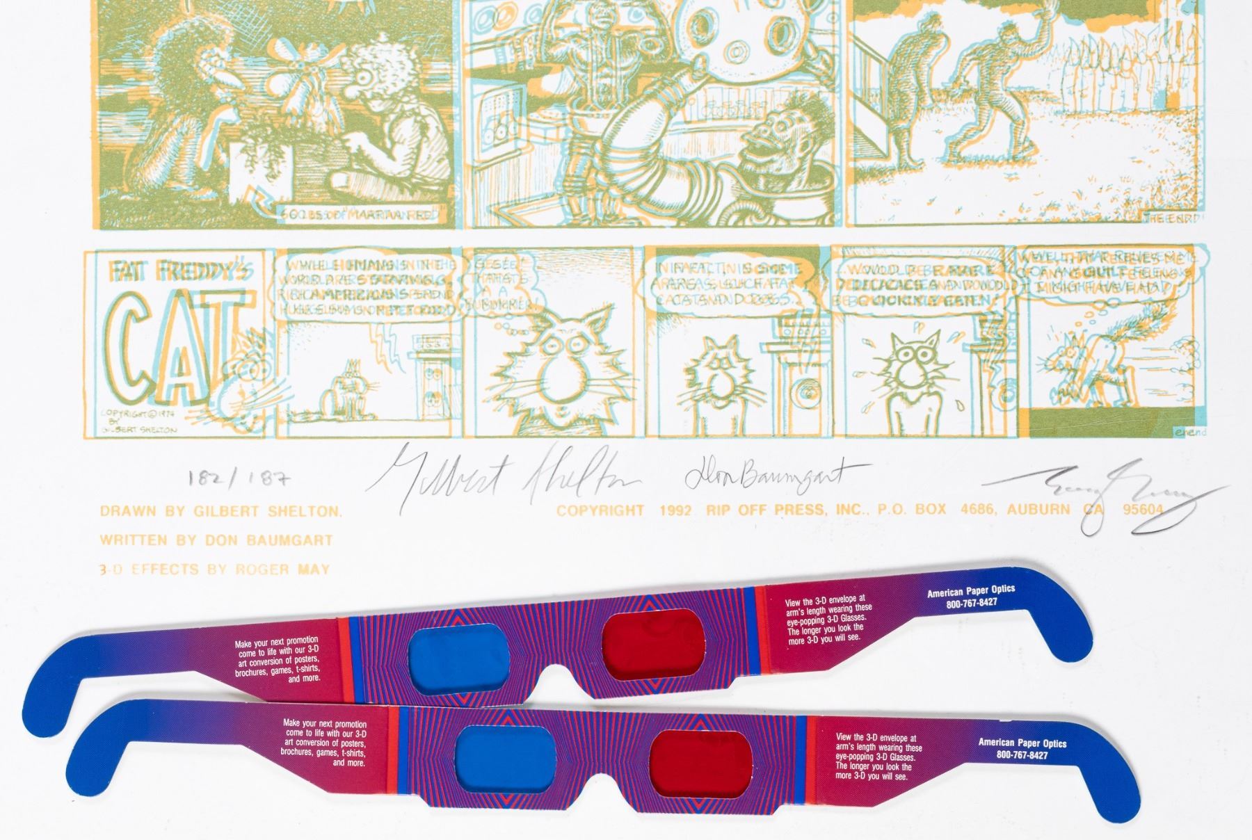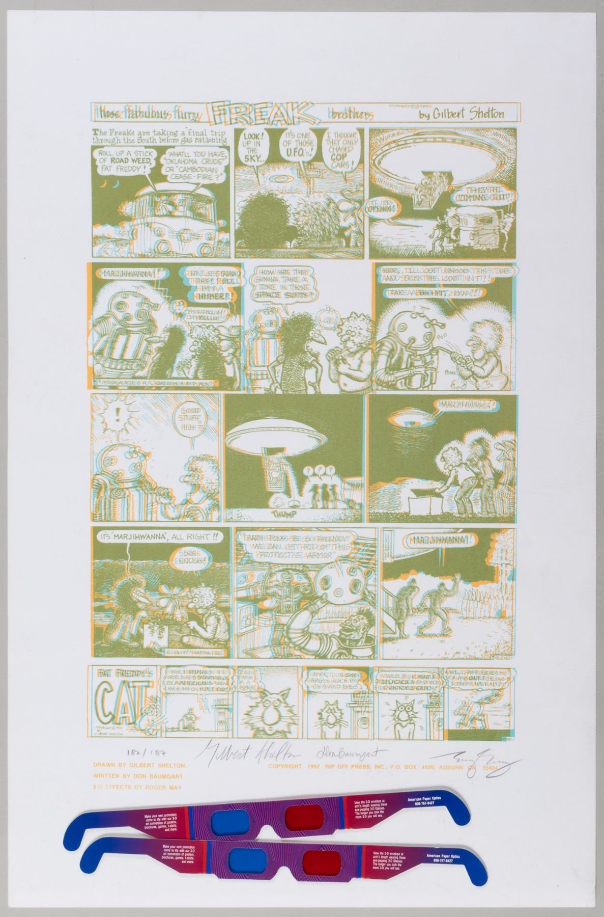3-D poster of 'Those Fabulous Furry Freak Brothers' signed by the artist Gilbert Shelton, the writer Don Baumgart, and effects designer Robert May, Rip Off Press, Inc., 1992, number 182 of 187 signed posters. Lot includes two 3-D glasses. 35 x 23 inches.