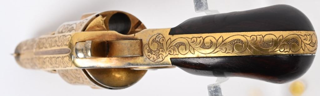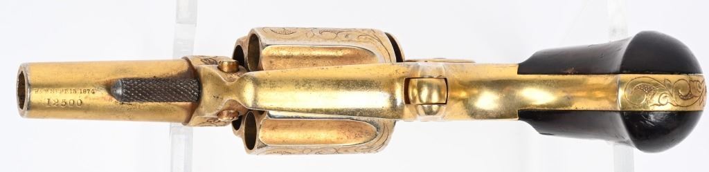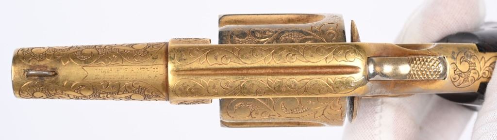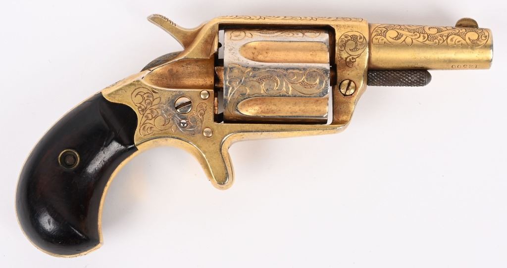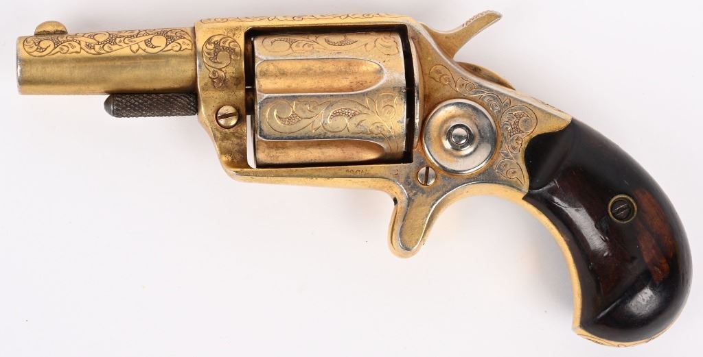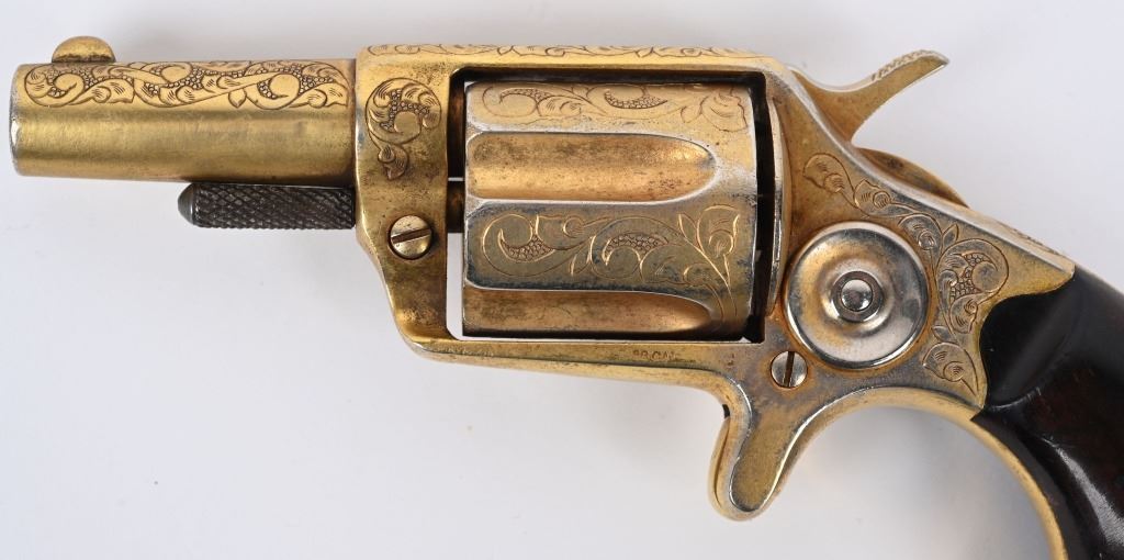 SERIAL NUMBER 12500 BARREL 2 1/4" CALIBER .38 SHORT COLT MANUFACTURED 1880. Single action spur trigger Colt New Line revolver with one of the highest ever recorded serial numbers produced in 1880. 5 shot fluted cylinder with 2 piece smooth rosewood grips. Engraved in a scroll and vine motif with dot punch background with extensive coverage on sides, grip strap, barrel , frame and high points of cylinder. Revolver is gold washed. CONDITION, Very good with properly operating action. Fine grips. Matching numbers on frame, barrel and cylinder. Good bore and chambers. ANTIQUE