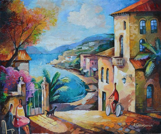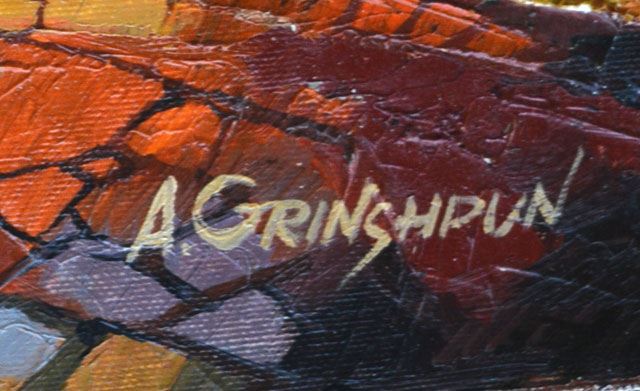 GRINSHPUN **UNTITLED ** ACRYLIC ON CANVAS. Artist: Alexander Grinshpun (b. 1949) - Title: Untitled - Medium: Original Oil on Canvas - Signature: This one-of-a-kind work is hand-signed by the artist at the bottom of the image - Image Size: Approximately 19 ¾ inches x 23 ¾ inches - Framed: Unframed on Unstretched Canvas - Details: This work comes with a Certificate of Authenticity - Biography: Born in Moldova in April 1949, Grinshpun graduated from art school in 1968. He specialized in creating background scenery for theater and opera at the St. Petersburg Art Academy. He also participated in many exhibitions across the former U.S.S.R., in cities such as Kishiniev, Odessa and Tiraspol. - Alexander has displayed in several local exhibitions in the Beit Shean Valley, as well as participating in group exhibitions at Chagall House in Haifa in 1994, 1995 and 1997. In 2003 he had a solo exhibition in the Center for Arts in Rishon Le Zion. Approximately 80 pieces were exhibited in two show rooms. Since November 2003, Alexander is exhibiting his works in a gallery in Raanana. In 2004 a few of his works were displayed in a NY exhibition. New York International "Art Expo" 2004-2007 his works were displayed in Art 107 gallery in Tel-Aviv, among other galleries in Israel. - Warranty: Item GUARANTEED to be as described