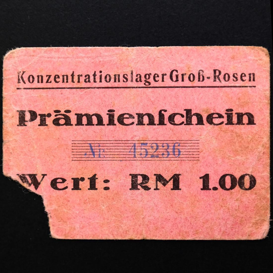 Konzentrationslager Gro-Rosen / Prmienschein / Wert: RM 1.00 on light magenta card, blue serial Nr. 45236, measures approx 75 by 51mm, creases, soiling and piece missing at lower left, Good.