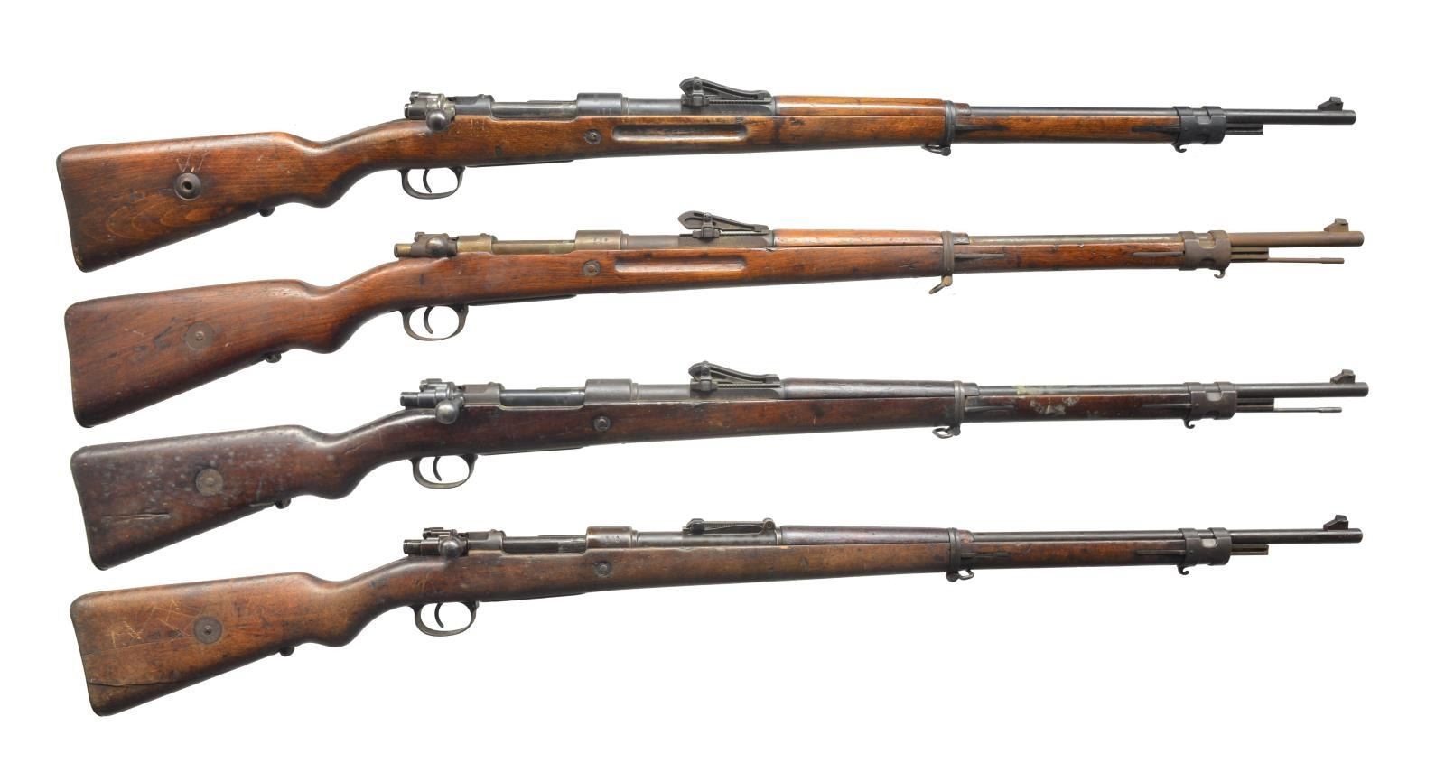 ALL: cal. 8mm Mauser. Bbls. 29 1/4". 1) S# 2879R. Left receiver rail marked “GEW.98”. Receiver ring marked on top “V.CHR. SCHILLING SUHL 1917”. Marked on right side w/ Imperial proofs. All visual #s match except bolt assembly. Straight bolt handle. Lange graduated to 2,000m; inverted V front sight; cleaning rod not present; hardwood stock set w/ walnut hand guard; buttstock marked on right side w/ Imperial crown acceptance marks & “B”. CONDITION: stock set has added flaking finish over wear, dents, staining & scratches; buttstock has 2 lg. cracks on left side. Metal has lg. percentage of arsenal rework, black finish w/ wear, oxidation & scattered light pitting. Lock screws are not present in trigger guard. Very good bore. (20-2957/RW). CURIO. 2) S# 8444BB. S# matches on bbl., receiver, rear sight & trigger guard assembly. Receiver rail marked on left side “GEW 98”; receiver ring marked on top w/ Imperial crown Danzig; additionally marked “1920”; marked on right side w/ Imperial proofs. Bbl. marked over chamber w/ "droop wing" eagle, Weimar proof. Rifle is a transitional model used by the Reichswehr. They were given a modernized tangent rear sight to replace the Lange sight. Rear sight is marked underneath leaf w/ "SS" indicating rifle is correct to use w/ "heavy ball" ammunition. Rear sight graduated to 2000m. Inverted V front sight. Straight bolt handle. Cleaning rod is not present. Upper band retains parade hook. Narrow lower band. Non-matching walnut stock set. Imperial acceptance marks on right side of butt. Stock disk markings are very faint. CONDITION: buttstock is heavily worn w/ staining, dents & scratches throughout. Buttstock has notable damage on left side from a metal fragment which is still imbedded deep within the stock. Stock has extensive cracking on both sides due to impact of fragment. Stock has crack on left side around recoil bolt. Metal turning overall gray & patina w/ wear, light oxidation & scattered fine pitting throughout. Rear guard lock screw is not present. Rear sight has notably more finish than balance of rifle. Fair worn bore. (20-2958/RW). CURIO. 3) S# 2109A . All visible numbers match except bolt assembly. Receiver marked on left rail "GEW.98" & is marked on top receiver ring w/ Imperial crown & "ERFURT 1905". Bbl. marked on top of chamber "S". Lange rear sight, inverted V front sight. Straight bolt handle. Cleaning rod is present. Upper band retains parade hook. Walnut stock set. Buttstock marked on right side w/ worn Imperial proofs. Disk marked "67.R.E. 3227." CONDITION: stock set has extensive wear, dents, staining & scratches throughout w/ added finish. Stock has notable gouge on left side over recoil bolt & on right side of buttstock at toe. Sm. area of white paint by butt swivel. Forend & bbl. have area of white stain between upper & lower bands. Forend has duffel cut by lower band. Metal has turned over all patina w/ oxidation & fine pitting throughout. Replacement bolt has retains 50% original blue. Poor worn oxidized bore. (20-2959/RW). CURIO. 4) S# 621AA. All visible numbers match except bolt assembly. Receiver marked on left rail "GEW.98". Receiver ring marked on top w/ Imperial crown, "DANZIG" & 1916. Bbl. marked over chamber "S". Lange rear sight graduated to 2000m. Inverted V front sight. Straight bolt handle. Cleaning rod is present. Upper band has parade hook. Walnut stock set. Acceptance marks on right side of butt have been obscured. Disk appears unmarked. CONDITION: stock set has arsenal rework type finish w/ added finish. Has wear, dents, scratches & staining throughout. Sm. gouge on top at heel. Crack at right top of grip. Metal has turned overall gray & patina w/ oxidation & fine pitting throughout. Rear sight has had metal removed on left side of slide. Replacement bolt does not seat fully home. Bore has solid full-length plug. (20-2960/RW). CURIO. $800-1,200.