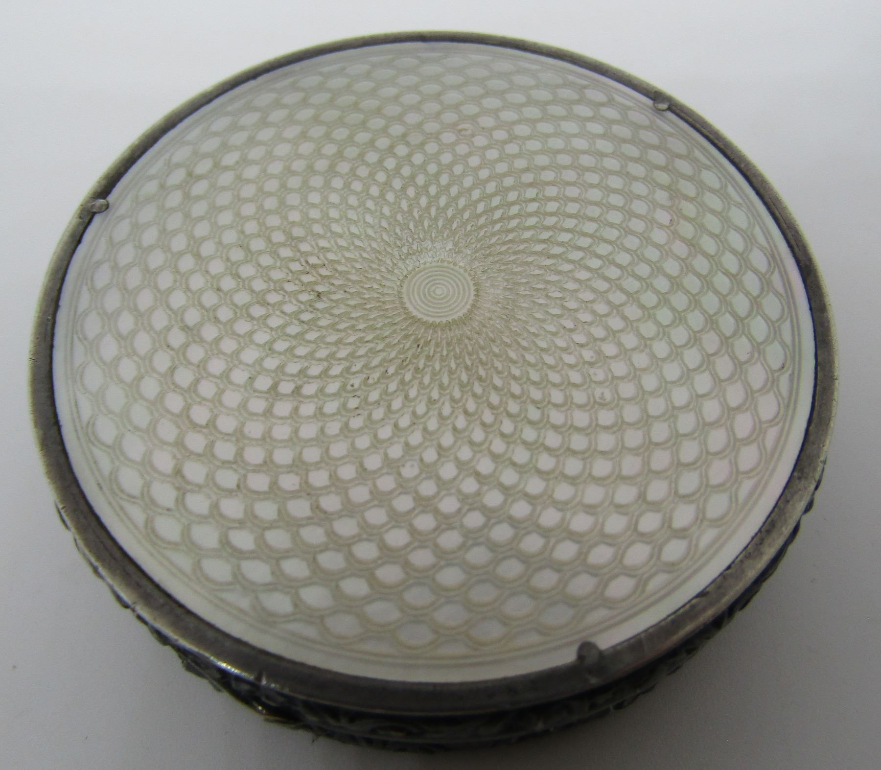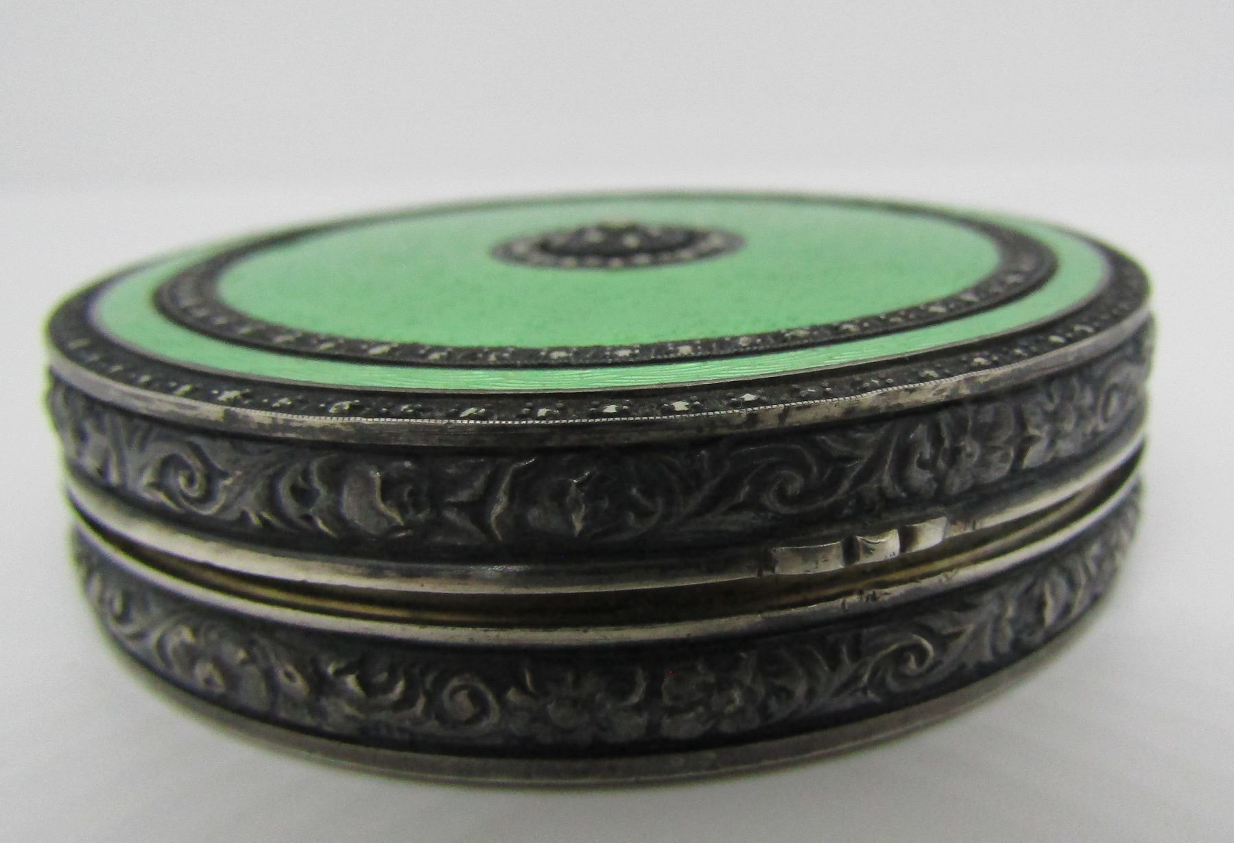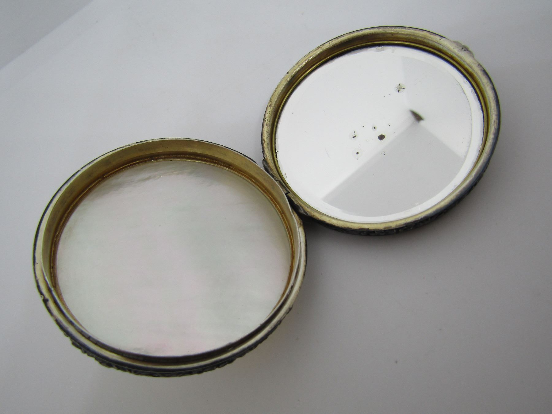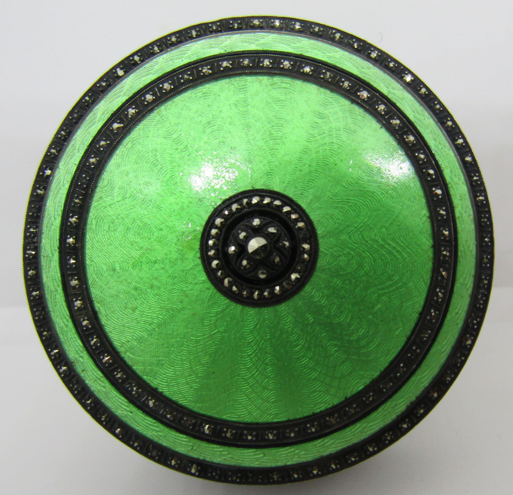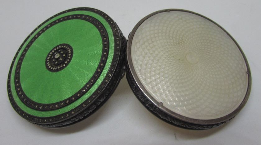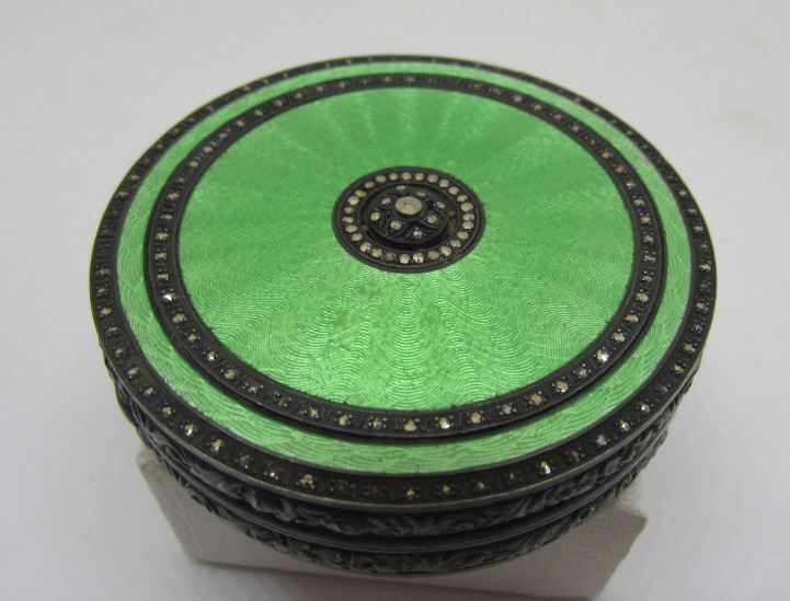 CIRCA 1920 MIRROR COMPACT CASE OR PILL TRINKET BOX. THE BOTTOM IS ONE LARGE PIECE OF ETCHED MOP - MOTHER OF PEARL. THE TOP IS ENCRUSTED WITH PRONG SET MARCASITE, ALL INTACT AND GREEN ENAMEL, ALL INTACT.MEASURES 52MM WIDE. USA SHIPPING $8