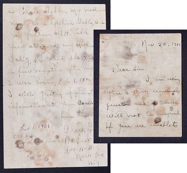 Gable, Clark - Asking His Doctor What Time He Was Born. A 4-page, handwritten letter, dated November 20, 1929, during Gable's brief Broadway period when he was probably playing the lead in "Machinal," signed once in the text and once at the end of the letter. To Dr. J.S. Campbell, the Cadiz, Ohio physician who delivered him. In part, "I would like to know as near as possible the hour of my birthMy name is Clark Gable. My mother's name was Adeline Gable, and my father W.H. Gable. You attended my mother in Cadiz, Ohio, and she died there a few months after my birth. I was born Feb 1, 1901." He signed his name at the end and added his address: "140 East 81, Apt 11-B, New York, N.Y." The doctor wrote on the bottom of Gable's letter, "5:30 a.m." and "Feb. 1, 1901" and returned the letter to him. Severe moisture damage but legible overall. Still a blockbuster for any cinema freak!