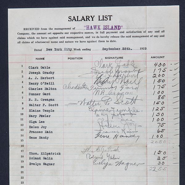 Gable, Clark. "Salary List" for the play "Hawk Island" signed by Gable beside his name, which is at the top of the list. The 8� x 14 in. document, date-lined New York City, for the week ending Sept. 28, 1929, lists all the cast members of the play which opened on Broadway, along with their weekly salaries. Gable, who starred in the role of Gregory Sloane, made $400 a week, twice the amount of the second highest salary listed. Each actor signed beside his or her name, including Henry O'Neill and Charles Halton. This is thought to be one of the earliest-known signatures of Gable extant, preceding by a year the onset of his Hollywood career. Accompanied by a color-copy promotional piece with a scene from the production showing Gable in formal wear, wielding a pistol, while O'Neill and others look on; also, a vintage newspaper ad listing the cast.