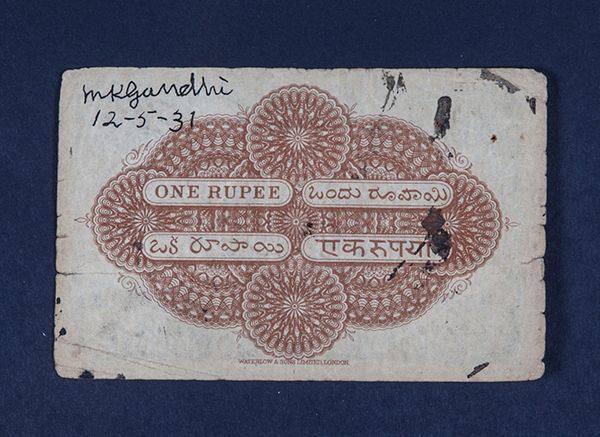 Gandhi, Mohandas K. "Mahatma" (1869-1948) Indian spiritual and political leader who used nonviolent resistance to obtain reforms. He successfully led India's struggle for independence from British rule (1947). Gandhi's nickname, "Mahatma" means "Great Soul." His method of nonviolent resistance was used in the American Civil Rights movement. One rupee note signed "MK Gandhi 12-5-31" in the upper left corner. Signed with a fountain pen in black ink. Note is worn and there are some contemporary ink stains, not affecting Ghandhi's signature.