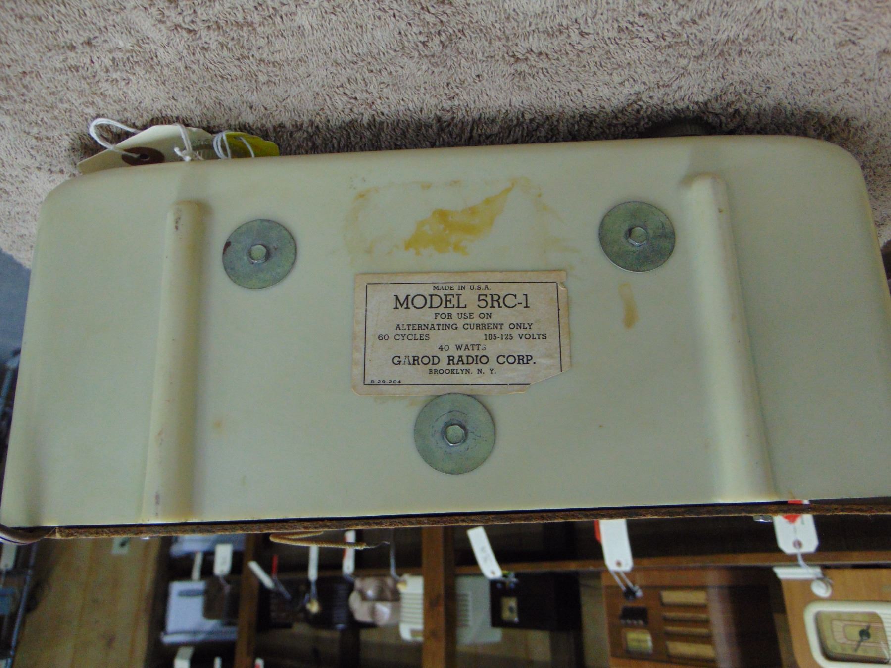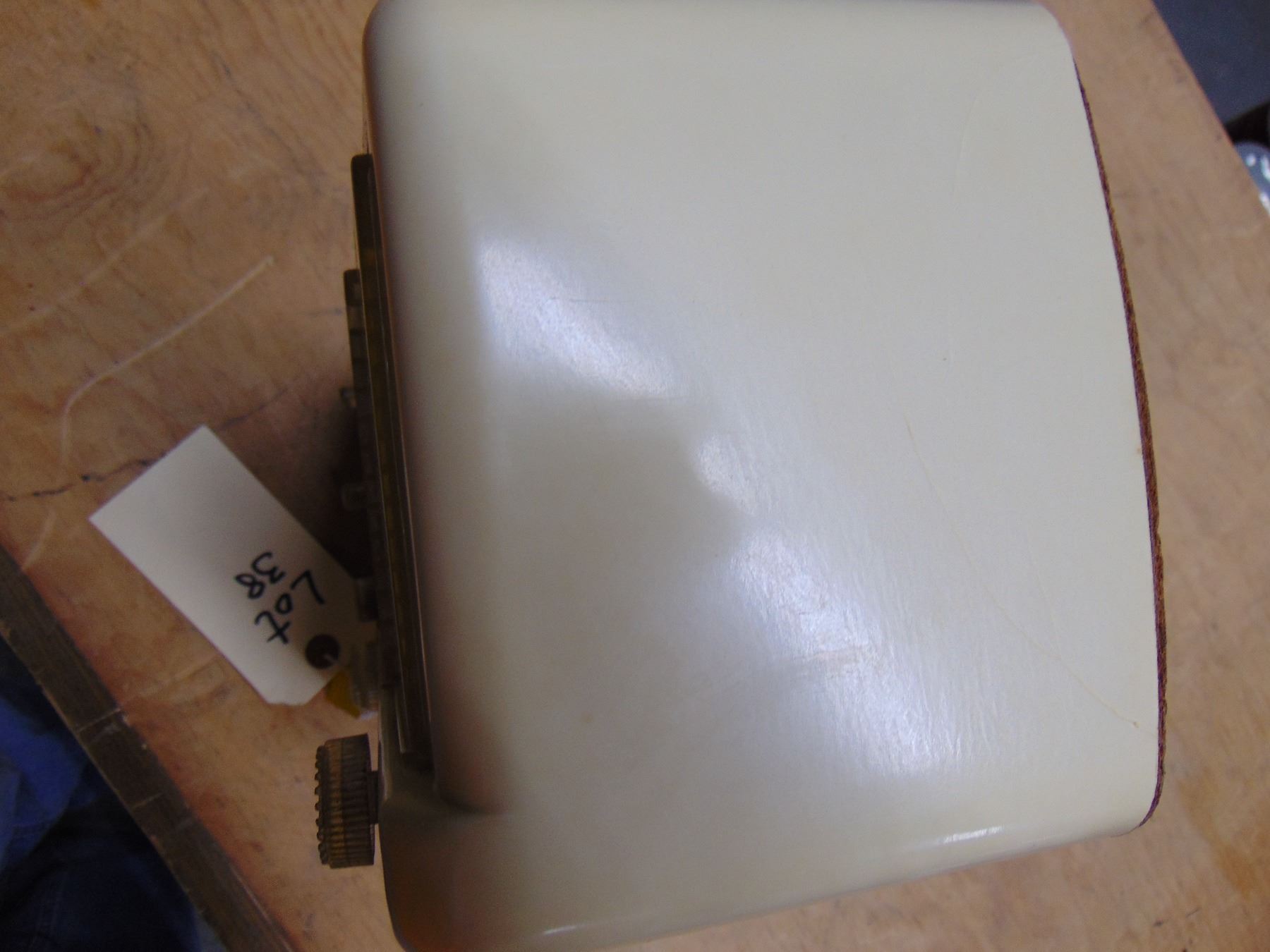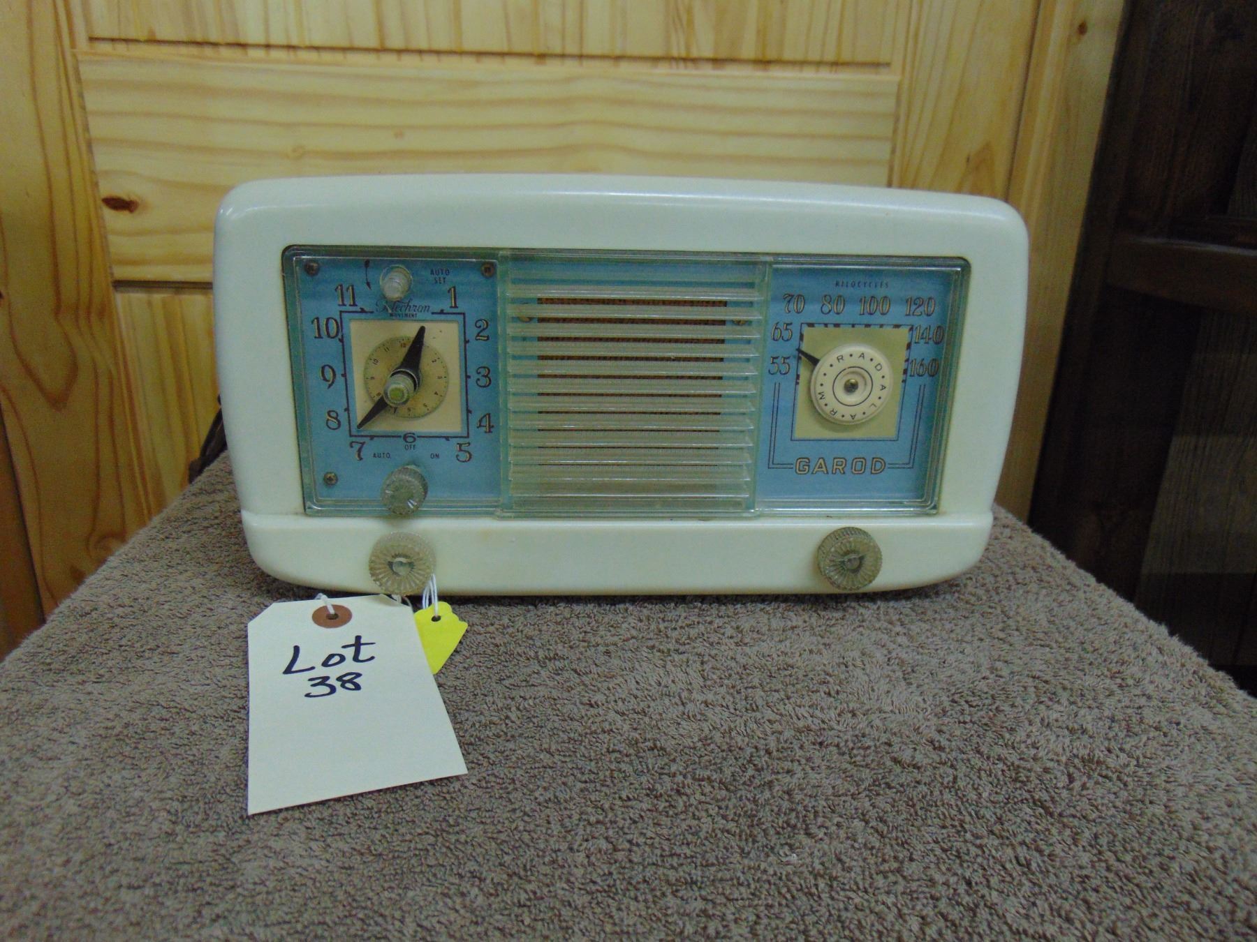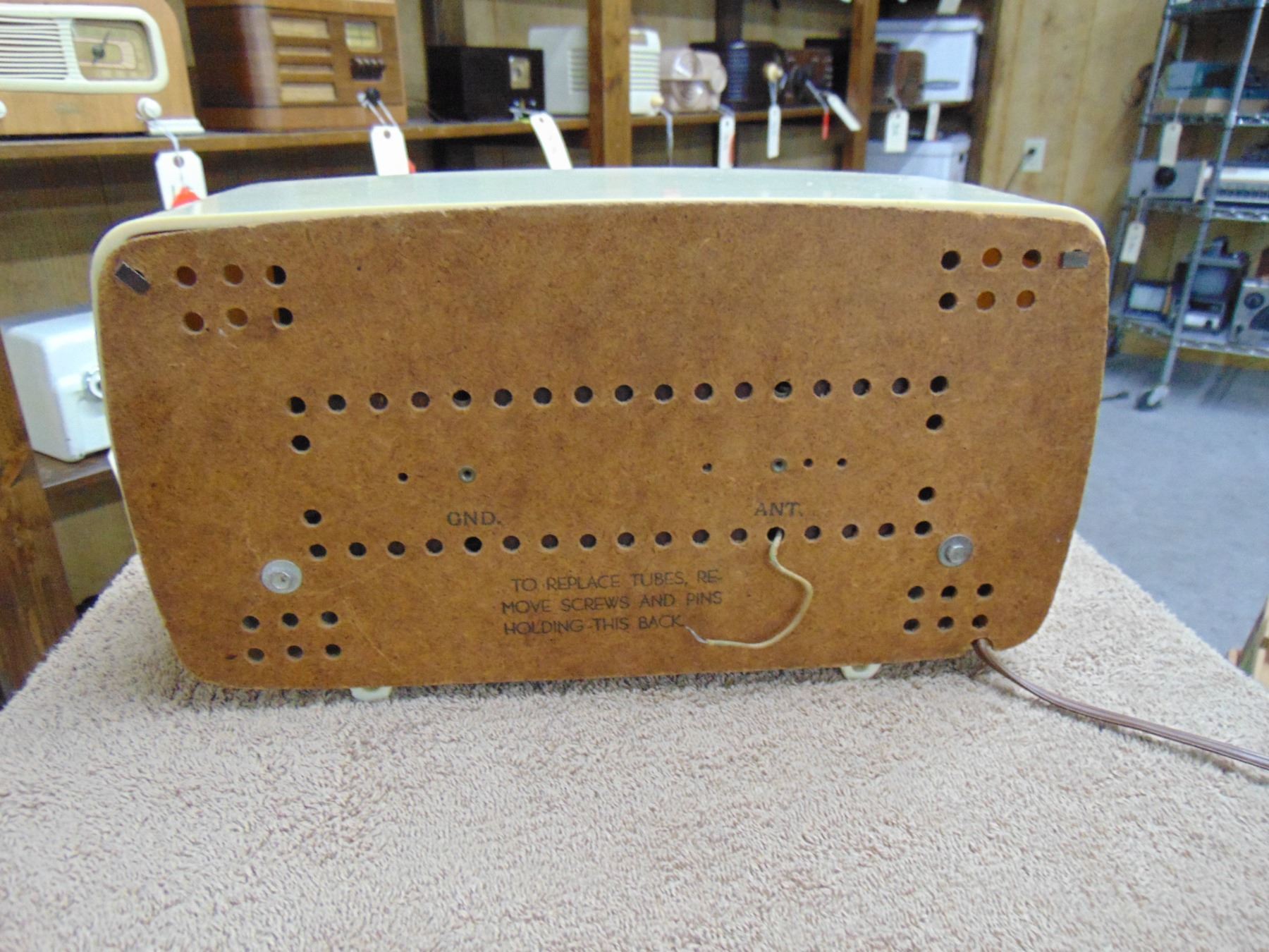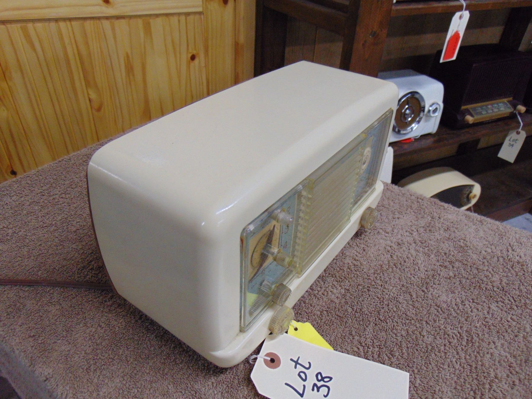 White plaskon table set; model 5RC-1; great styling; clock radio with blue face; radio plays; hairline crack on side; cute!!