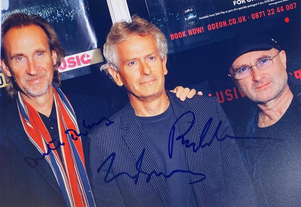 Genesis facsimile signed photo autographed by Tony Banks, Mike Rutherford and Phil Collins. 8x10 inches. This item is a reprint of an original autograph