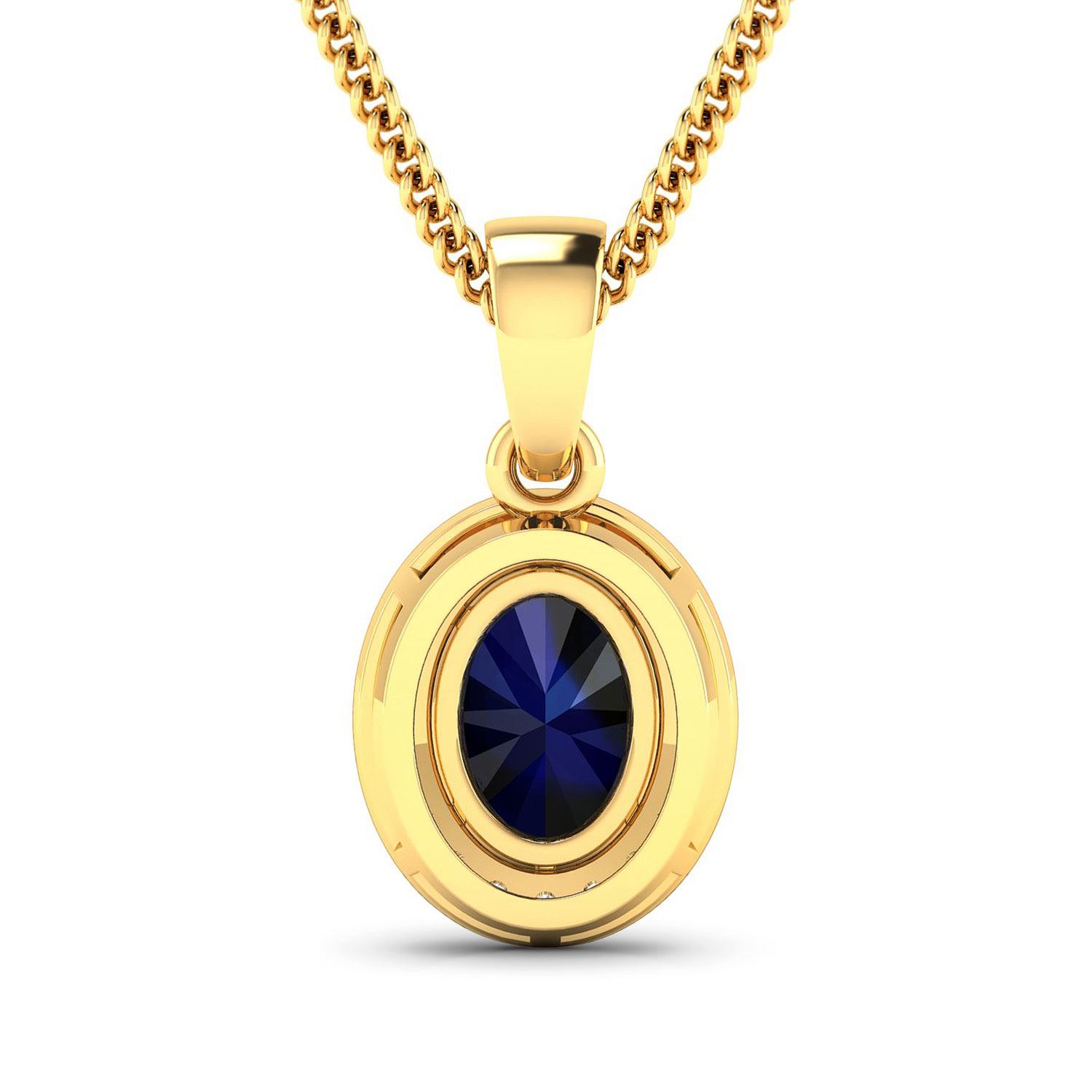 This 14 karat yellow gold pendant features a 1.30 carat oval-cut, genuine blue sapphire* that is prong-set with .18 carats total weight of round, brilliant-cut, H-I color, I1 clarity diamonds in the halo and solid bail.