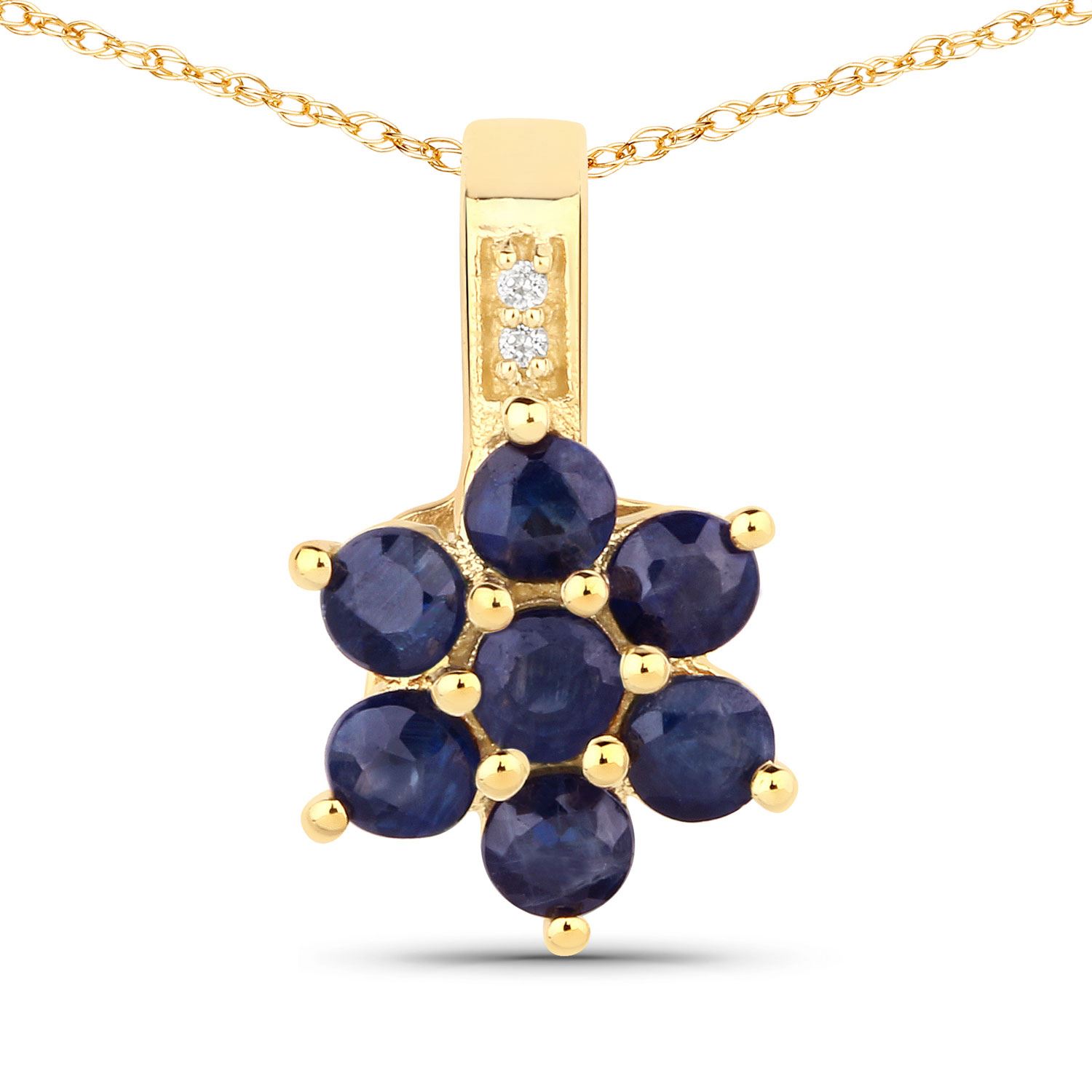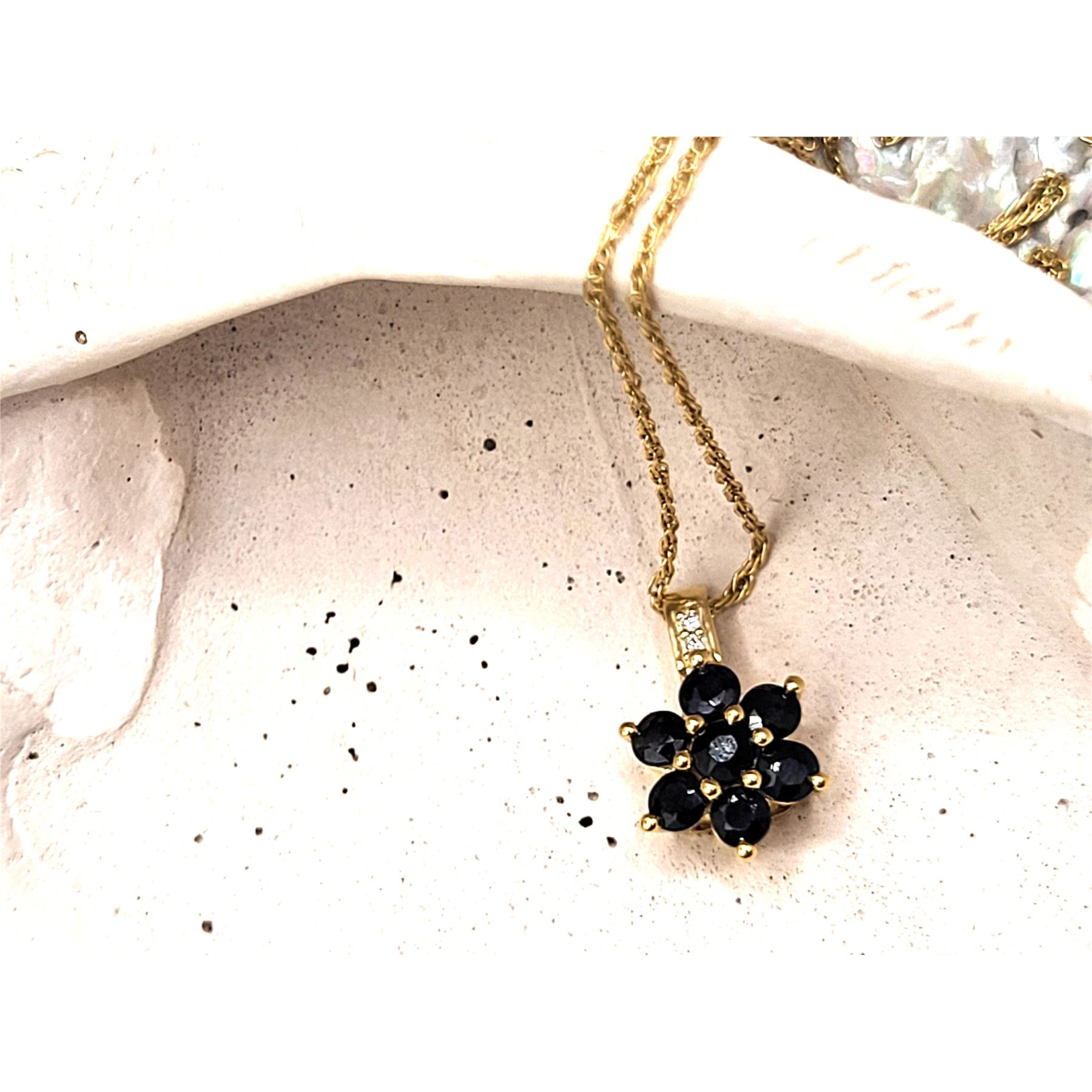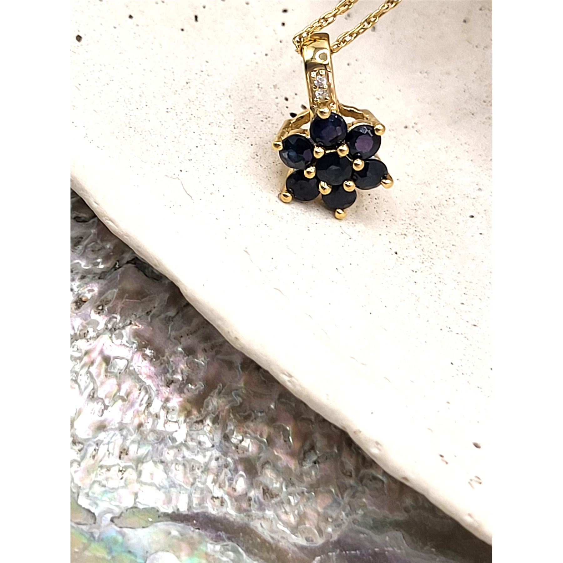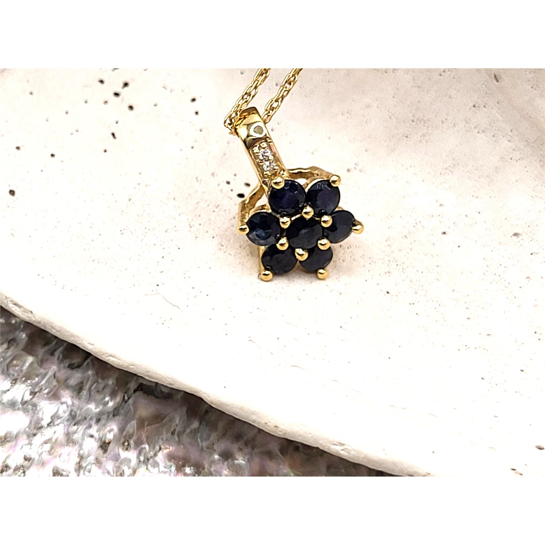 This 10 karat yellow gold necklace is adorned with a precious pinwheel-like circle of approximately .42 carats total weight faceted, dark blue, genuine sapphires and a diamond-accented solid bail.& nbsp; The chain is an 18& quot; fine rope with a lobster clasp.& nbsp; The pendant is approximately 3/8& quot; diameter.& nbsp; Admin: KQ12671blt